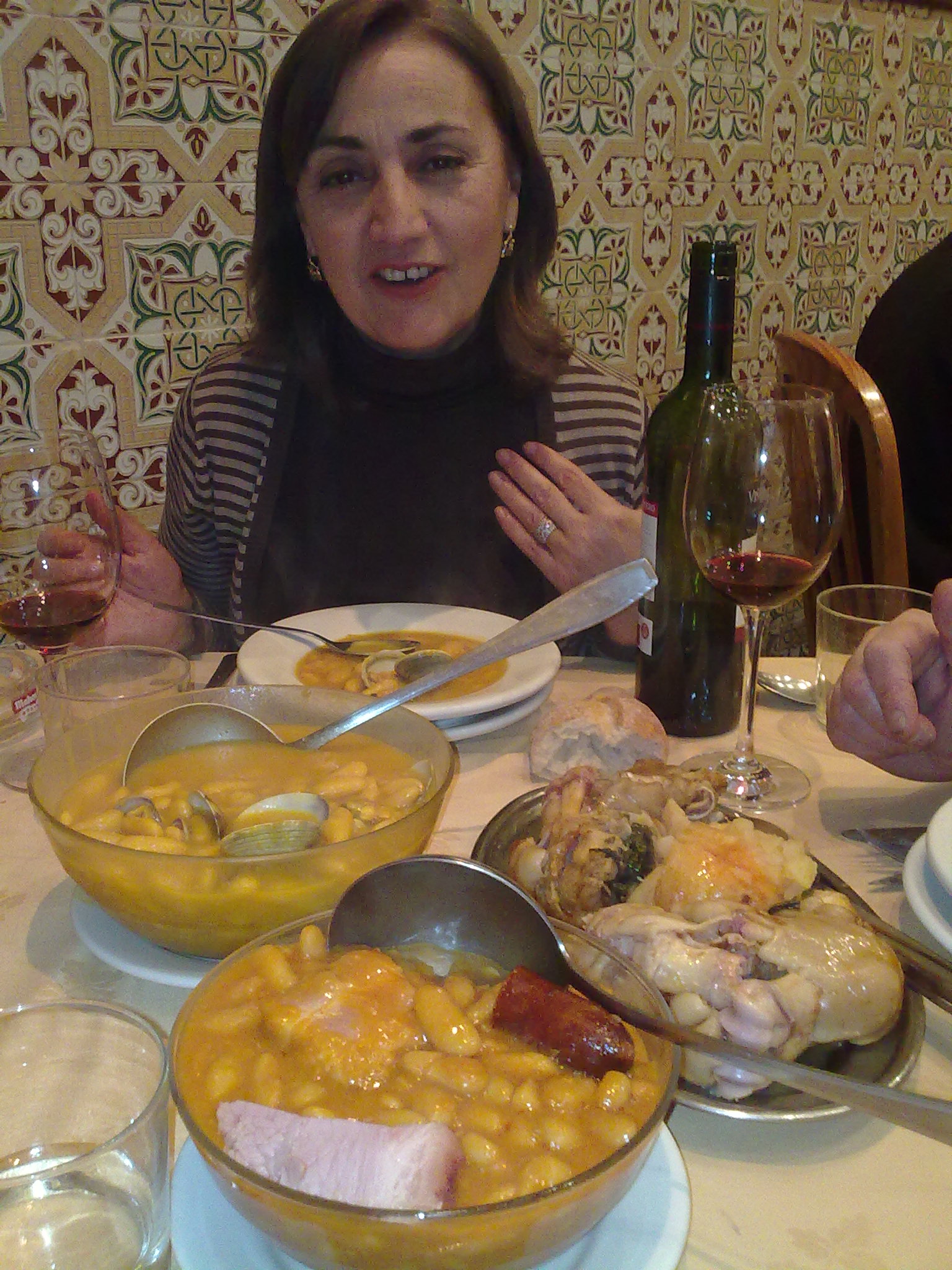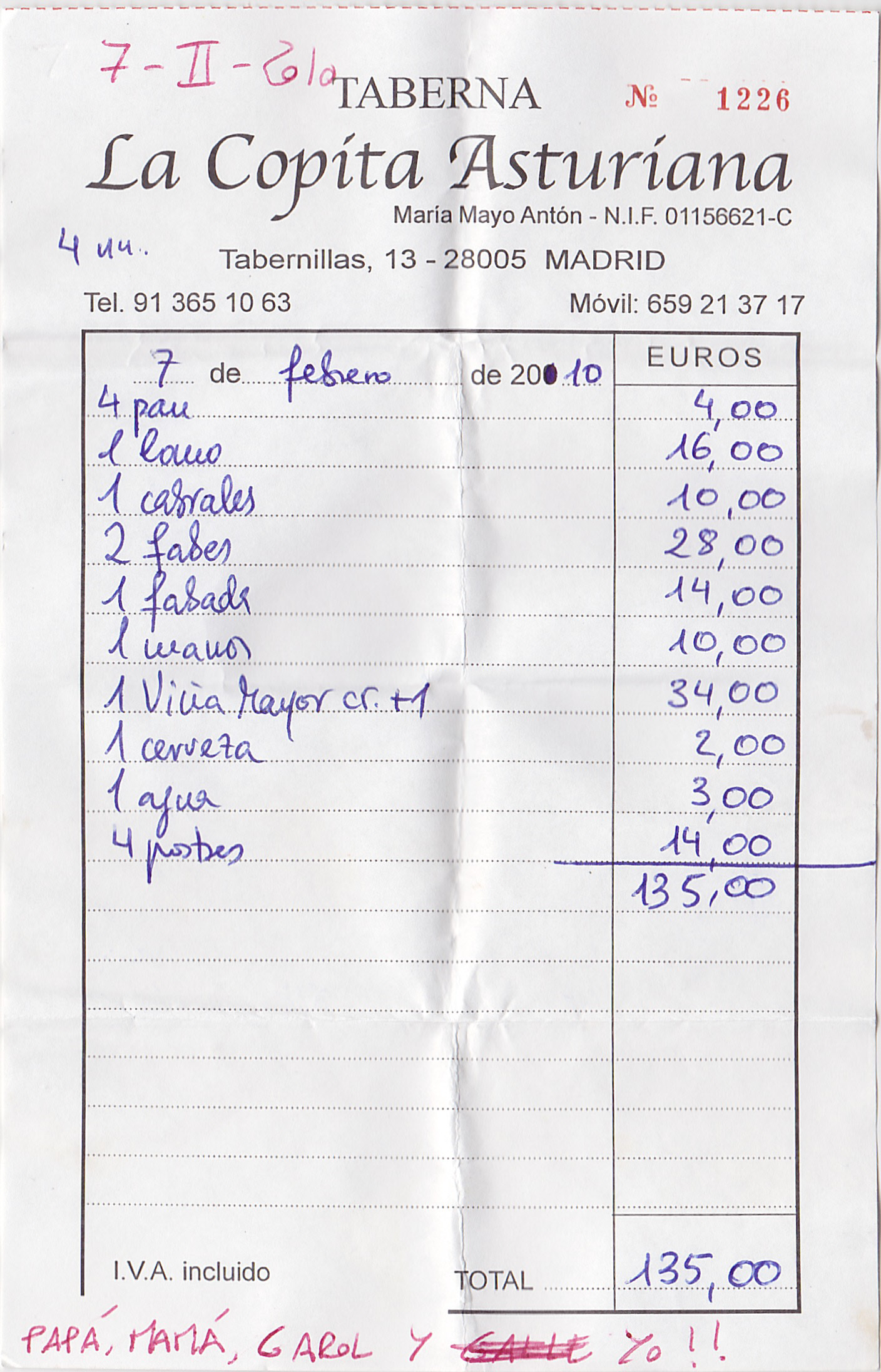 Os dejo una foto de los platos que comimos la última vez que me di un homenaje con mis padres. El plato más cercano es una fabada bien aliñada con su tronchaco de tocino. Detrás a la izquierda le acompañan unas fabes con almejas y a la derecha unas manitas de cerdo. Al fondo, con cara de «niño tú echa fotos que al final te vas a quedar sin nada» está mi madre. Es bastante buena señal que casi no habíamos empezado a comer y la botella de vino ya está más vacía que llena. A continuación, os dejo la factura de ese día escaneada para que os hagáis una idea del precio.