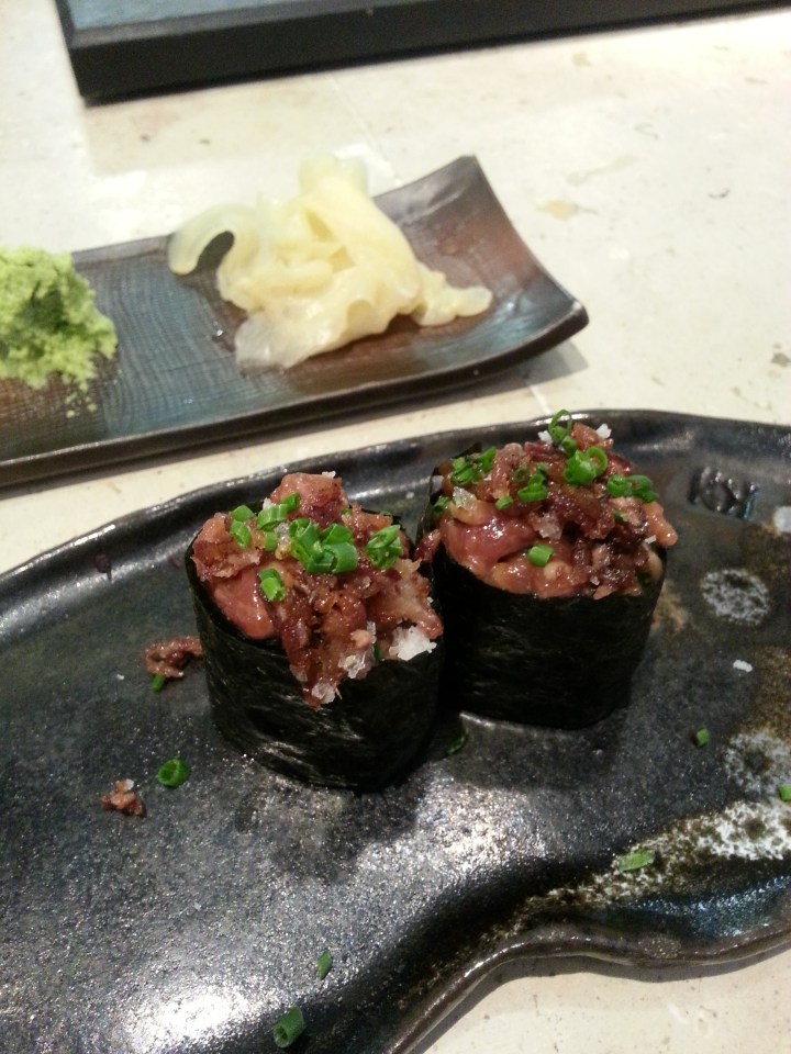 En carta hay algunos niguiris que sorprenden al leerlos. Y el que nos sirvieron a continuación era uno de ellos. Sushi de cortezas de waygu.
