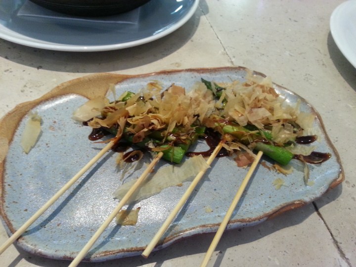 Después del maki hot, nos sacaron unas brochetas de espárragos con atún seco. Era un aperitivo antes del sukiyaki de cordero que fue el plato estrella de la visita.