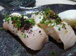 Empezamos con una tira de lubina bastante buena (pero puede ser prescindible) y de ahí pasamos a darnos una primera mano de Niguiris. Todos los niguiris llevan un toque diferente de lo convencional así que merece la pena probarlos. Nos gustaron especialmente el de pez limón, huevo de codorniz, el de tira de asado y el de foei. La foto es del niguiri de pez limón.