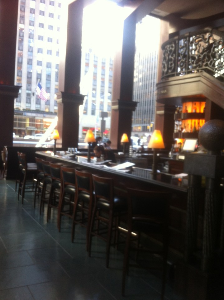 Del Frisco’s NY está situado en el 1221 Avenue of the Americas, en el bajo del edificio McGraw-Hill, muy cerca de Rockefeller Center. El local es uno de esos bajos espectaculares de NY con techos de unos 8 metros de altura, lo que permite distribuir el comedor en dos alturas, creando un ambientes animado frente a la barra y otro más tranquilo arriba. La decoración es lujosa pero discreta y luce sobre la barra el lema del local: Do the right and fear no man.