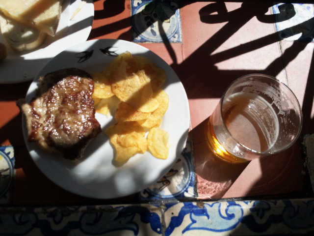 Y una vez situados, lo primero es calzarse una caña bien fria y… a comer y beber, comer y beber, pim-pam pim-pam. El buen rato que pasamos allí aquello era un no parar de actividad. Los camareros volaban llevando bandejas para la planta de arriba donde tienen las mesas grandes. La escalera es estrecha y ya quisiera ver yo si los del Circo del Sol se las apañan tan bien.