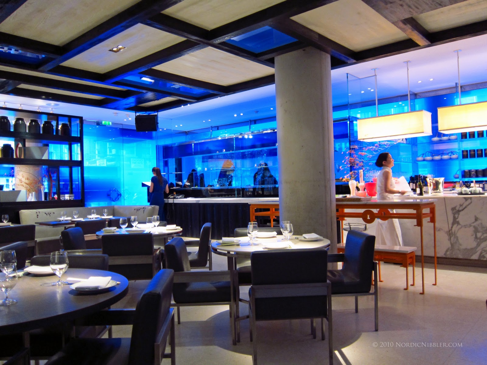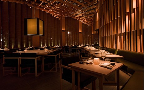 Sake no Hana, by Hakkasan. Este es el hermano japonés del Hakkasan, que es de comida china. Su situación es fantástica, en la calle St James y lo primero que llama la atención al entrar es su decoración, enrevesada y simple al mismo tiempo, mediante un entramado de listones de madera. Al comedor en la primera planta se llega en escalera mecánica, y desde ahí al aseo hay que bajar en ascensor directo al sótano.