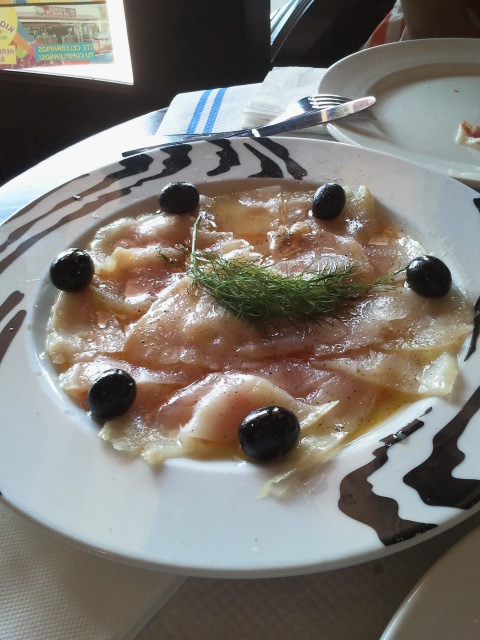 Lo siguiente que pedimos fue un carpaccio de bacalao. Olvídate de un plato escaso con cuatro laminillas finas de bacalao. Nada de eso. Un buen plato con lomos de bacalao en aceite realmente bueno. La foto lo dice todo.