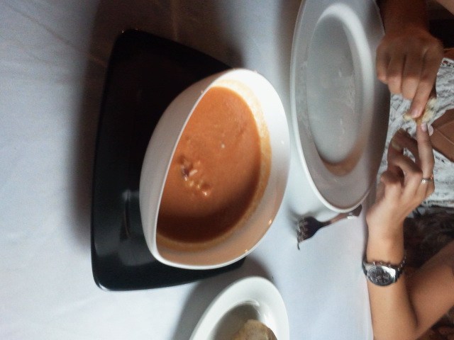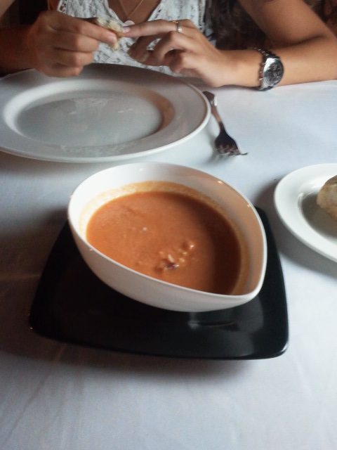 La carta es bastante extensa con entrantes, ensaladas, tostas, pescados y carnes. Este veranos cenamos a base de entrantes. Empezamos por un salmorejo con jamón ibérico. El salmorejo no estaba ligado y era más una sopa que no un salmorejo cremoso. Y un pelín de vinagre de más para mi gusto.