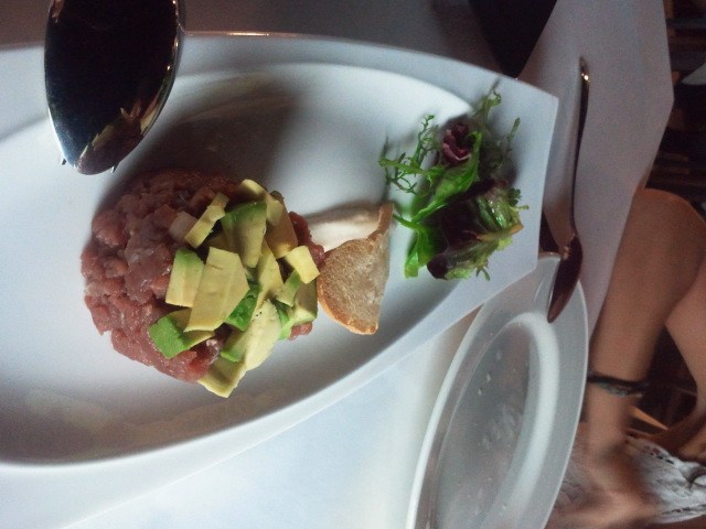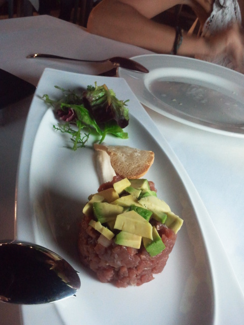 De ahí pasamos a un tartar de atún con aguacate. Lo dicho, el tartar lo presentan en un lpato alargado muy resultón con el tartar (mini tartar) en un lado y un poco de ensalada en el otro. El tartar estaba sosete y no tenía ningún tipo de aliño o aderezo. Me dio la sensación de que sólo era carne de atún machacada, con un poco de aguacate encima y punto.