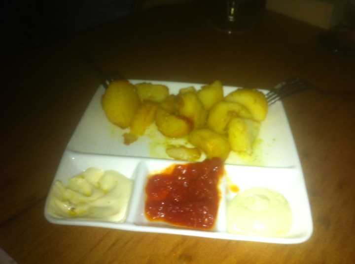 Biotza (corazón en eusquera) es un restaurante-bar de pinchos vascos que lleva ya unos años. Merece la pena sobre todo por los pinchos. El restaurante es más caro y más corriente. Empezamos el recorrido con un par de cañas grandes bien puestas, unas bravas y unas hamburguesitas. Las bravas estaban estupendas, muuuy jugosas y un poco crujientes por fuera. Las hamburguesitas lo mejor sin duda. La carne gordita, poco hecha y tierna como la mantequilla. Lleva una especie de salsa barbacoa pero sin el dulzor excesivo que suele tener.