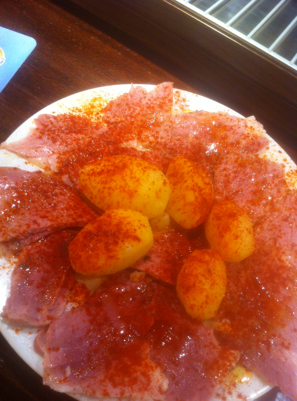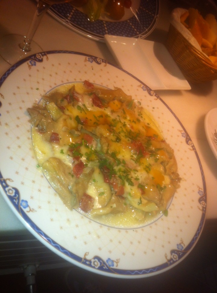 Tras esto quisimos ir al Sula, que también estaba cerrado, así que acabamos en frente en la Colonial de Goya. Este no lo conocíamos y pedimos al azar una ración de setas gratinadas con jamón en tacos y torta del casar. Qué manjar dios mío! La verdad es que acertamos e intuimos que el resto de platos también podían haber estado bien. Con las cañas, tamaño pequeño, nos pusieron unos canapés de jamón y de salmón un poco resecos.