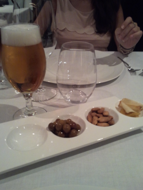 Empezamos con una cervecita y nos sacaron unas aceitunas bien buenas, unas almendras marconas fritas y unas patatillas buenas.