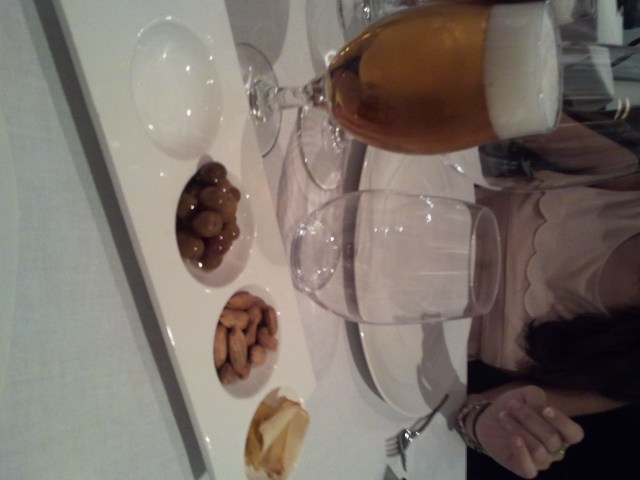 Las cosas ya se empezaron a poner un poco más serias con unos snacks de falsa cerveza, aceituna y cherry de pimiento de piquillo relleno de crema de anchoa.