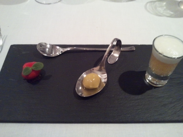 Por último el postre y mignardises. El postre era una ensalada de pan y chocolate que no empalagaba nada. Yo no soy muy de dulces y este destacaba por eso. Sabroso pero sin que te reviente. Y con el café nos sacaron unos bombones de chocolate blanco muy bueno.