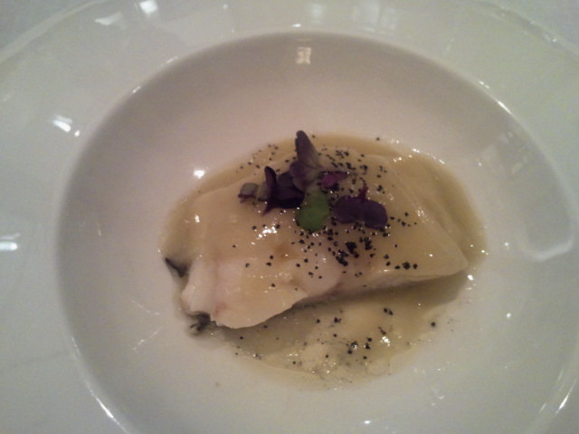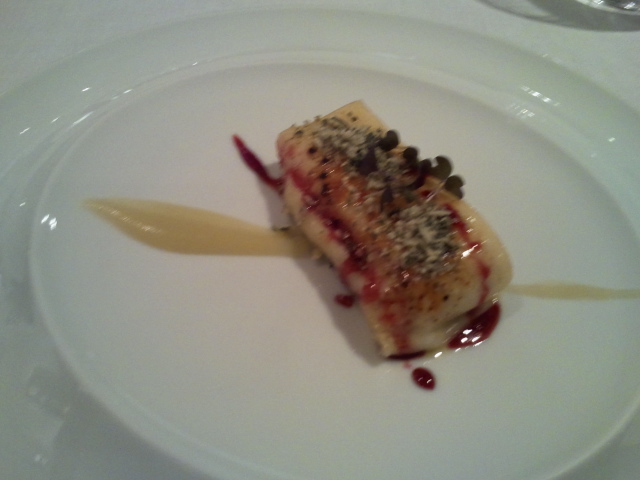 Después del último plato ya vas de lujo. El primer principal era un bacalao con un pilpil de «carbón y romero». El bacalao suave y sabroso y con un gusto a sarmientos que de ahí supongo que vendrá lo de «carbón». Muy bueno y el pilpil es de matrícula.
