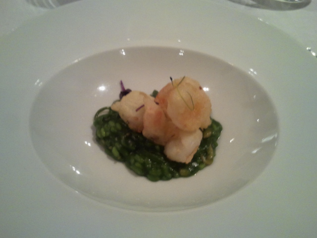Lo siguiente, un rissoto con algas wakame y tempura de langostino realmente de órdago. Los langostinas en tempura son un bocado fino finísimo. Un plato de esos buenos que te hace darte cuenta que lo que tú preparas comparado con eso es cómo compararte con Xabi Alonso jugando al fútbol. Ellos profesionales, tú un mindundi aficionado.