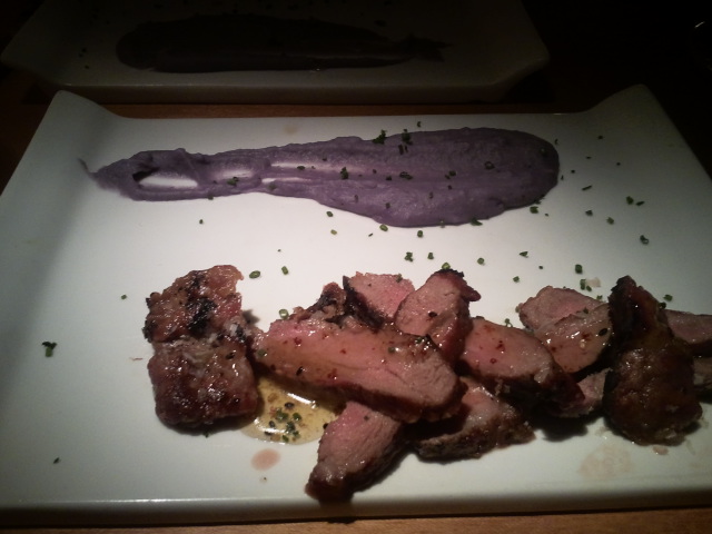 Tras un par de comentarios, ahí empezamos a darnos cuenta que la camarera que nos estaba atendiendo era apañada. Después resultó que realmente, no era apañada, era la jefa, la special one, la bomba, una crack. Abrimos la carta y empezamos a preguntarla. Trasparente total nos dijo que la pizza no la pidiésemos, y que teníamos que probar la ensaladilla rusa. Que para ir allí y no pedirla mejor no ir. Con dos narices. Y de segundo ni hamburguesa ni leches, Pluma de ibérico con puré de patata violeta a compartir y punto. Y amenazó diciendo que del postre ya hablaríamos.