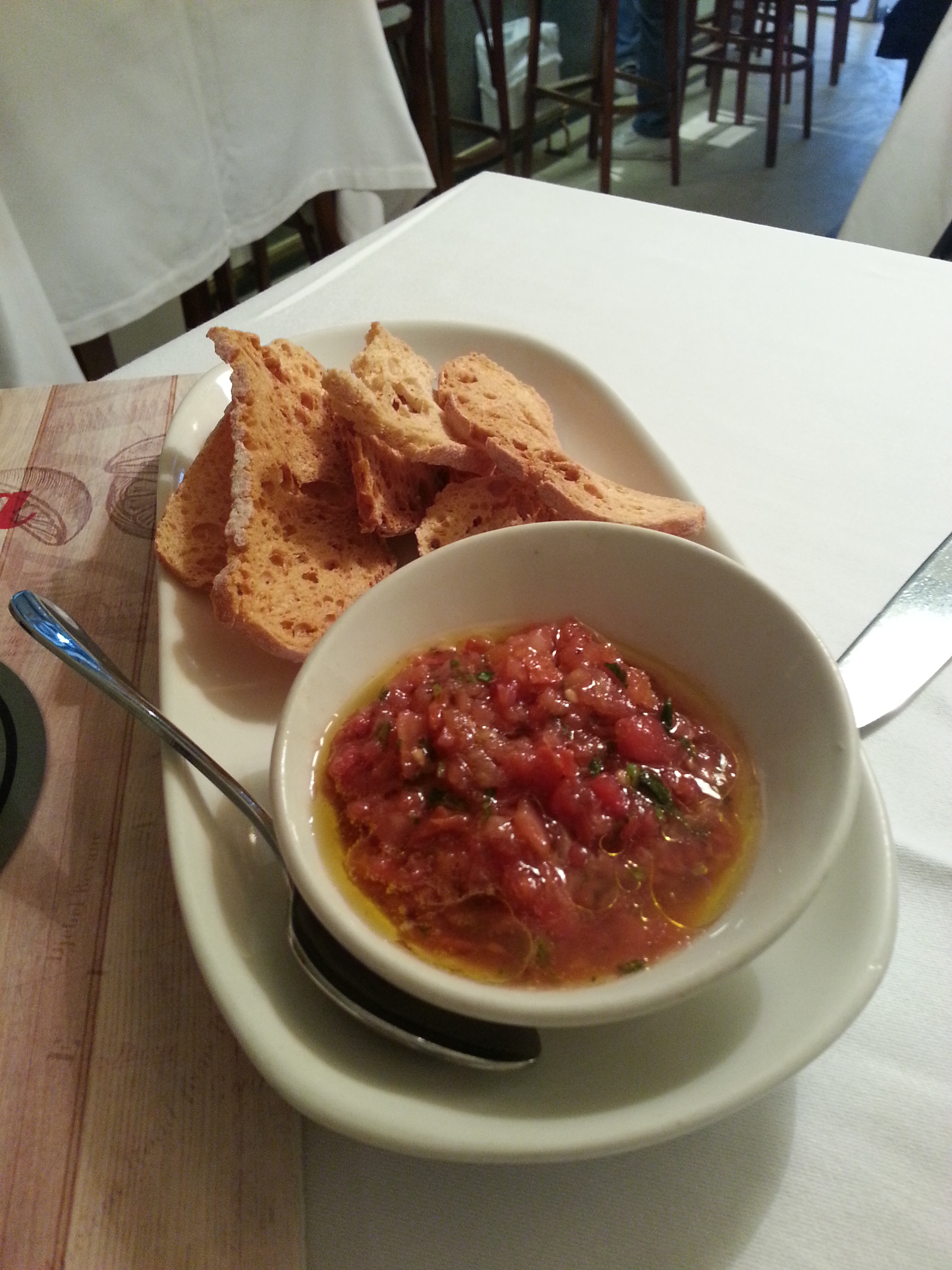 Bueno pues nada más sentarte, con la cerveza te ponen un buen aperitivo de tomate y albahaca.