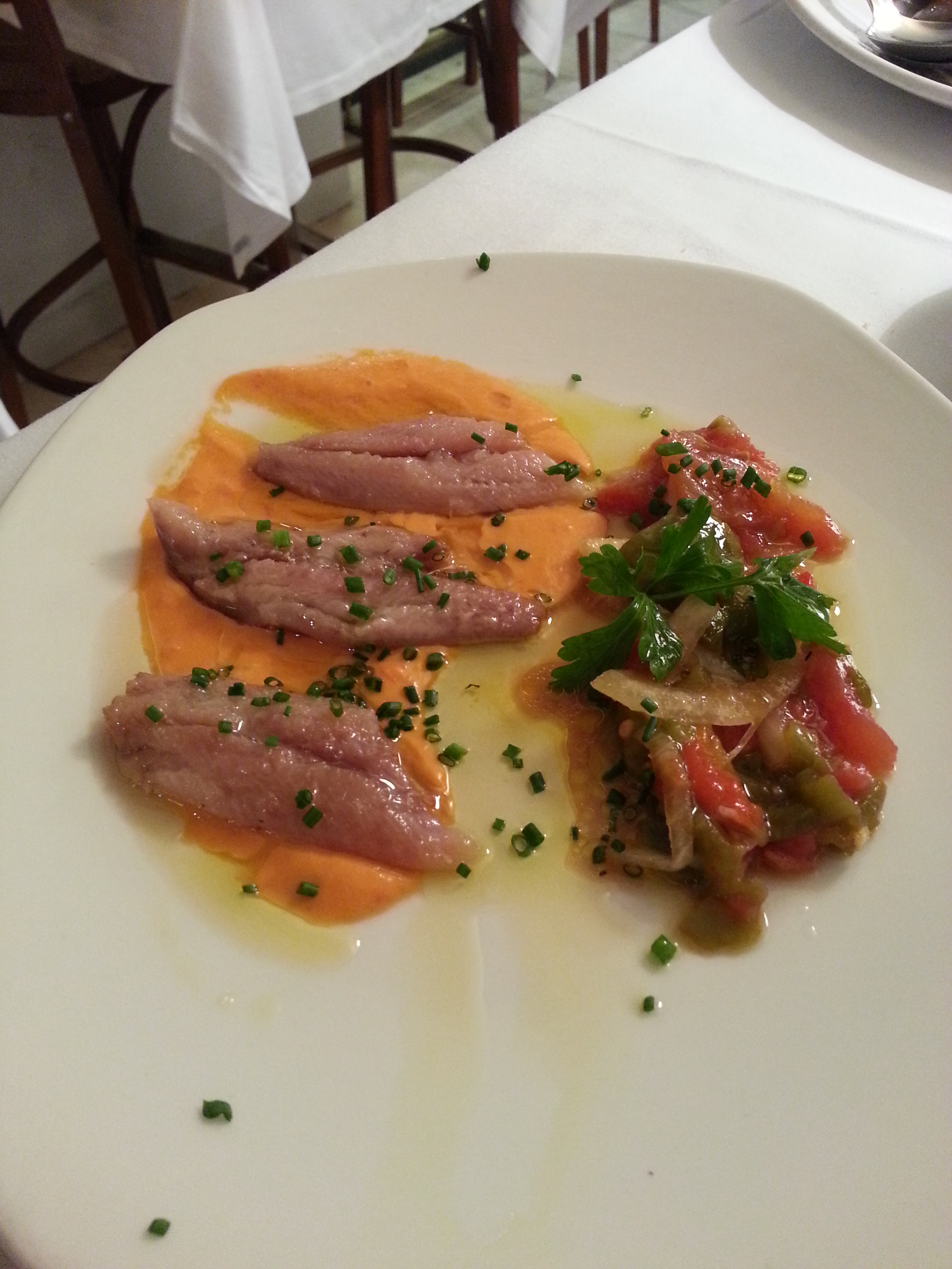 Empezamos con unos filetes de sardinas ahumados con escalibada. Era media ración y entran tres lomos de sardinas. Muy buenas y sobre una cama de salmorejo suave.