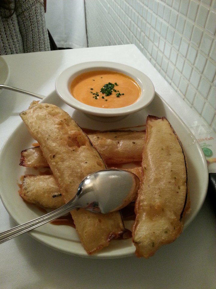 Tras las dos primeras entradas pasamos a unas berenjenas fritas con miel de palma que nos encantaron. Las berenjenas las cortan muy finas, el rebozado es ligero y la miel de palma está buenísima. Lo acompañan con un poquito de salmorejo bueno también y suave. Muy buenas.