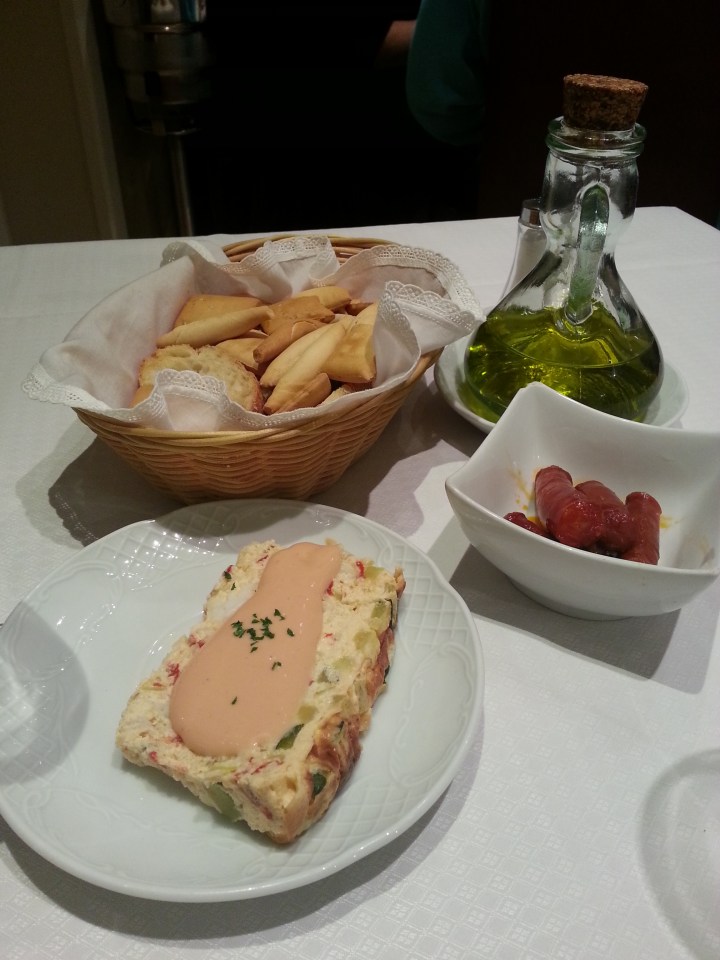 Pues pasemos ya a la comida. Parece que últimamente los restaurantes se están esmerando en servir aperitivos más elaborados y contundentes, para que vayas salivando mientras lees la carta. En este caso nos sirvieron unas chitorras pequeñas, jugosas y muy buenas y un pastel de verduras y pescado (supongo que sería cabracho) con salsa rosa.