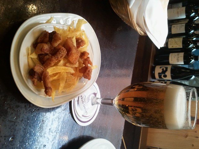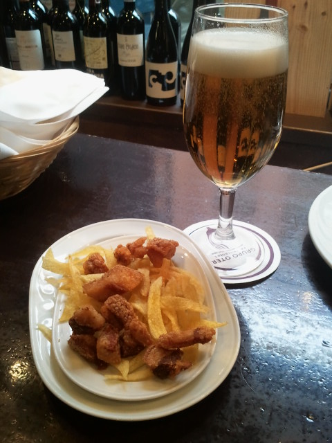 Pues lo dicho, me senté en la barra y me pedí una buena caña. De aperitivo me pusieron unas patatas con torreznos. Muy buenos.