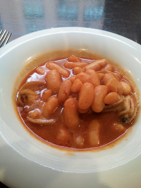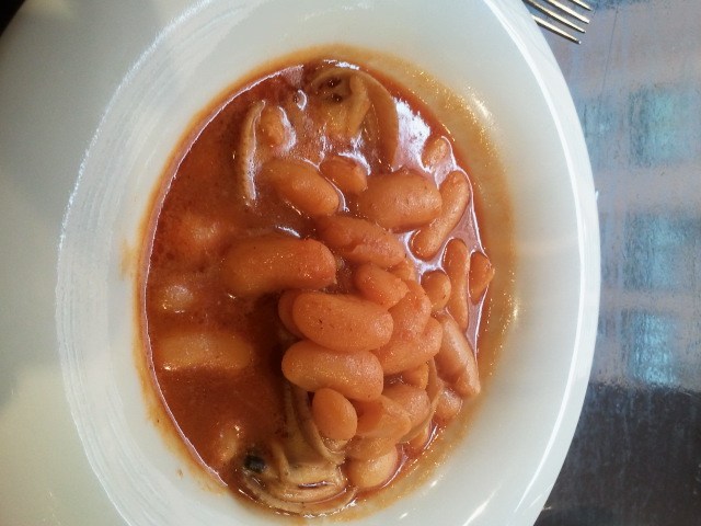 Lo primero que me tomé fue media ración de uno de los guisos del día. Las pochas con almejas y txangurro. Buena pocha, muy buena almeja y el toque del txangurro hacen un plato realmente bueno.