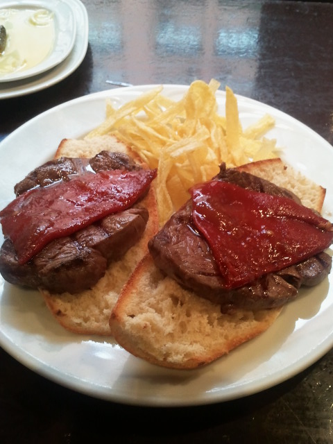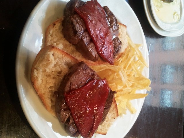 Y para terminar, que después había que trabajar, una tosta de solomillo con pimientos de piquillo confitados. Exquisita y generosa. La tosta cuesta 8€ pero de verdad que merece la pena. Solomillo en su punto y con unos pimientos confitados excepcionales. Tengo que volver a probar algún plato de carne más serio, aunque la tosta me pareció estupenda.