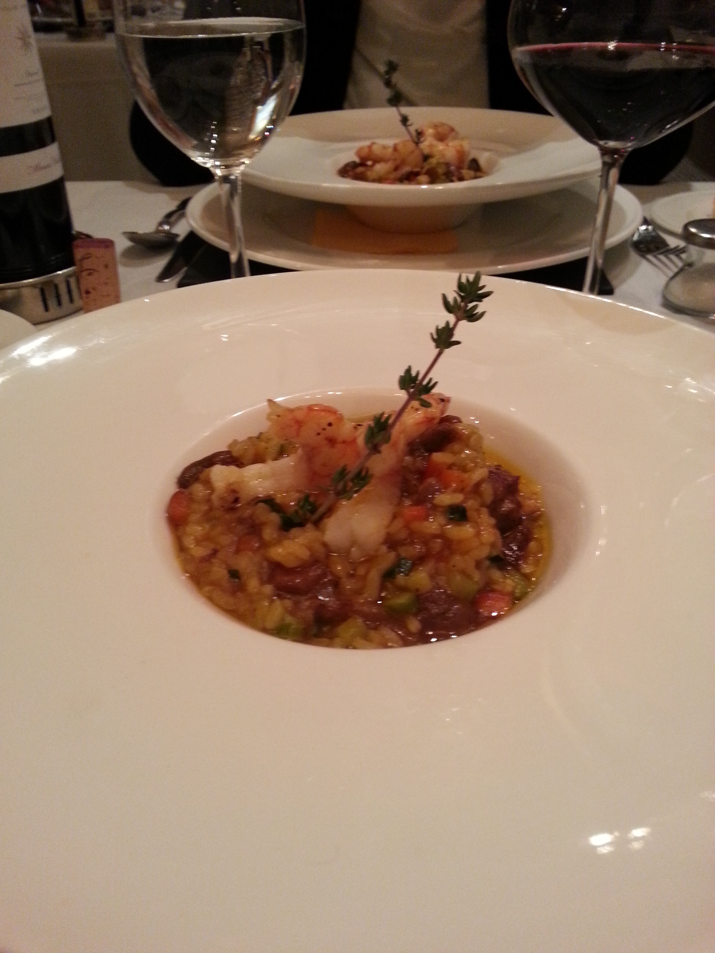 El primer entrante, un arroz cremoso con costilla de jabalí y langostinos del delta del Ebro. Mar y montaña de lujo. Exquisito. Cuando le insinuamos a Abraham, que aunque no fuese uno de los platos del día le íbamos a hincar el diente, nos dijo que él personalmente lo considera uno de los mejores platos que tiene en carta. Así que Amén.