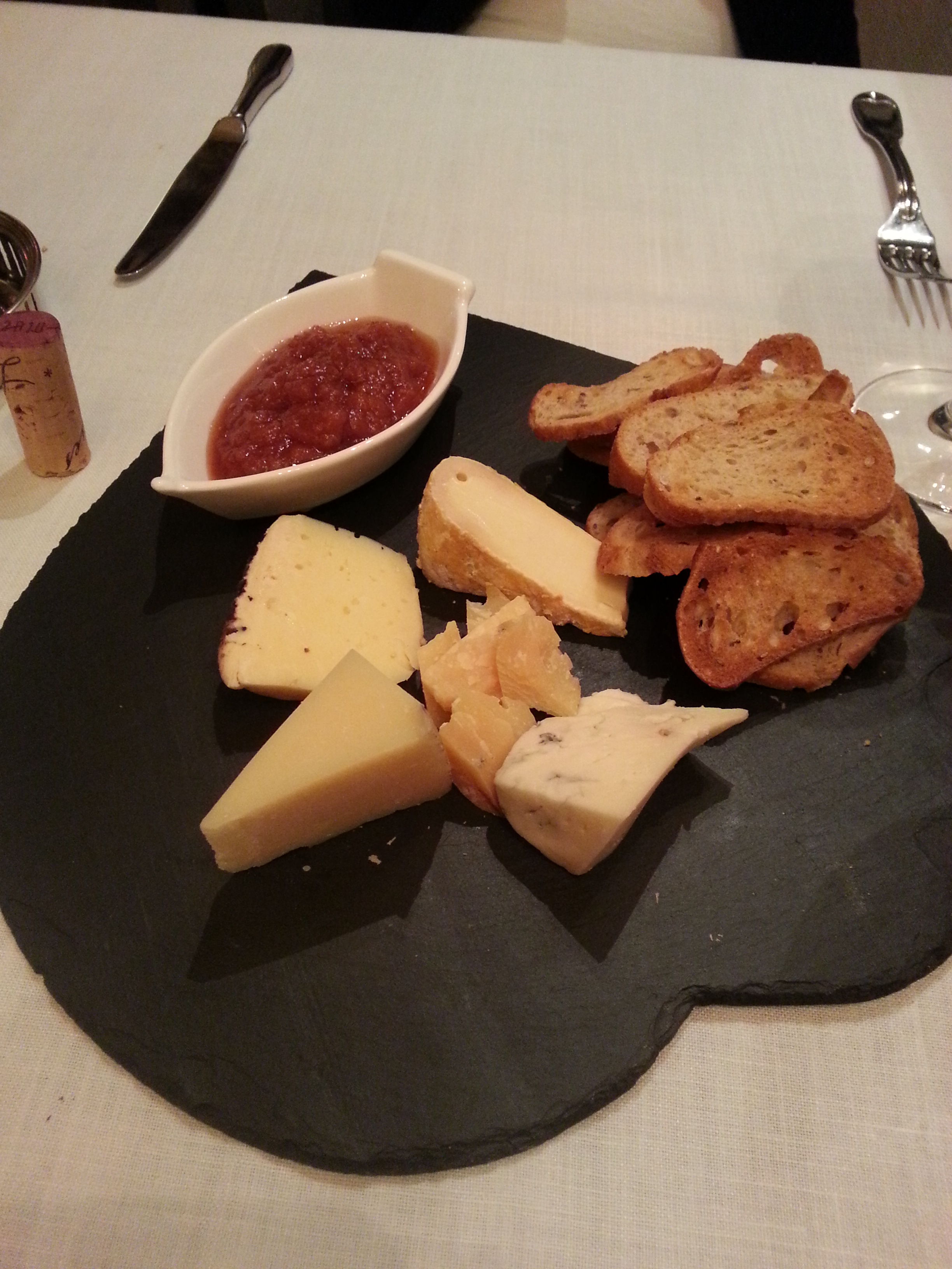 De postre, pues también un poco de degustación de quesos. Muy buenos y entre el camarero y nosotros intentamos adivinar cuales eran. Un poquito de Mahón, Stilton, manchego… la cena ya estaba muy avanzada como para retener tanta información. De acompañamiento una compota de tomate muy buena.