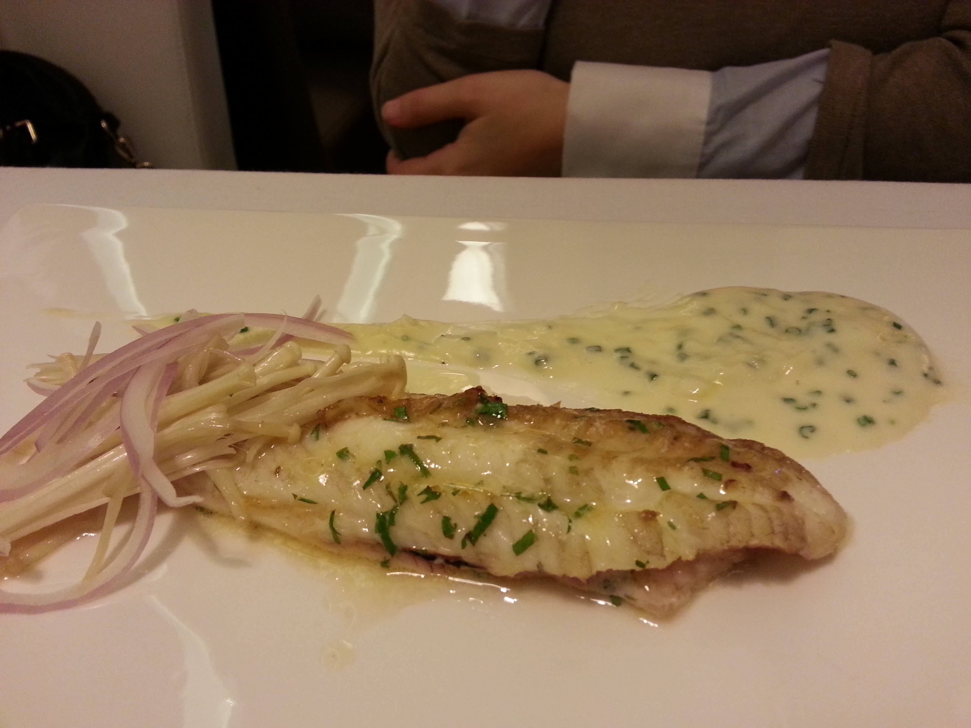 También probamos el lenguado meunière con enokis y ajo asado. Es solo medio lenguado, pero estaba muy muy rico y bien preparado. Los enoki son unas setas alargadas japonesas que podéis ver la foto bajo la cebolla. Mi madre probó las vieiras a la plancha con cigalas y miel de sus cabezas. Un plato un poco escaso como segundo pero magnífico entrante, súper sabroso!