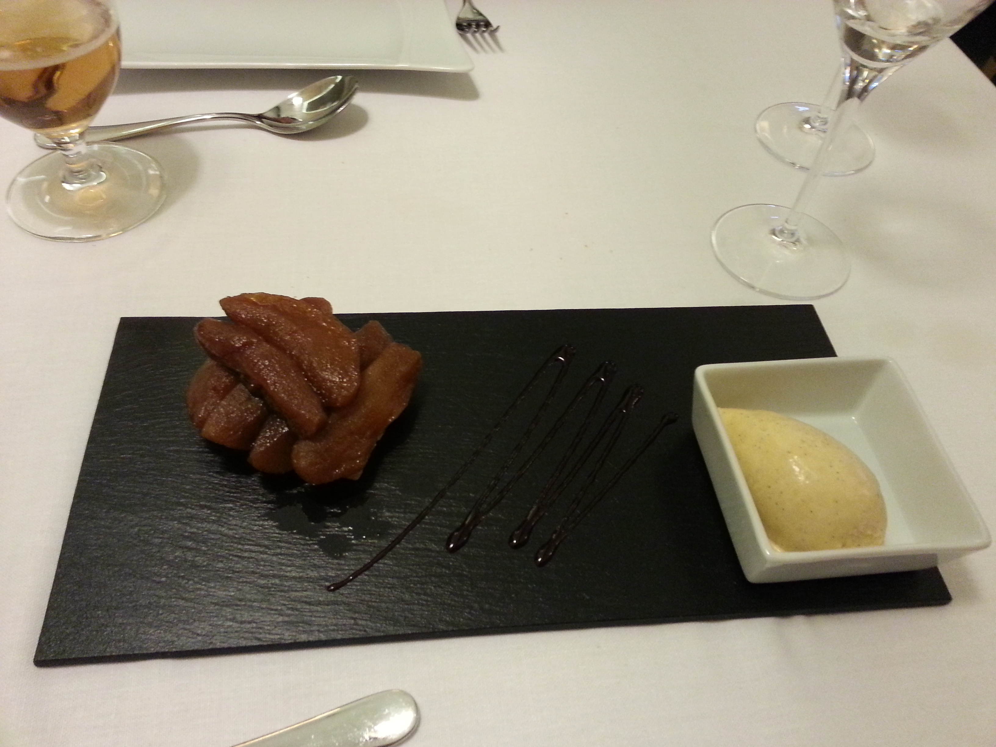 (De postre Gallego pedió tatín de manzana golden horneada con helado de vainilla de Tahití todo elaborado por ellos y muy bueno. La manzana golden dulce pero nada empalagosa y la mezcla con el helado hace un postre completísimo.)