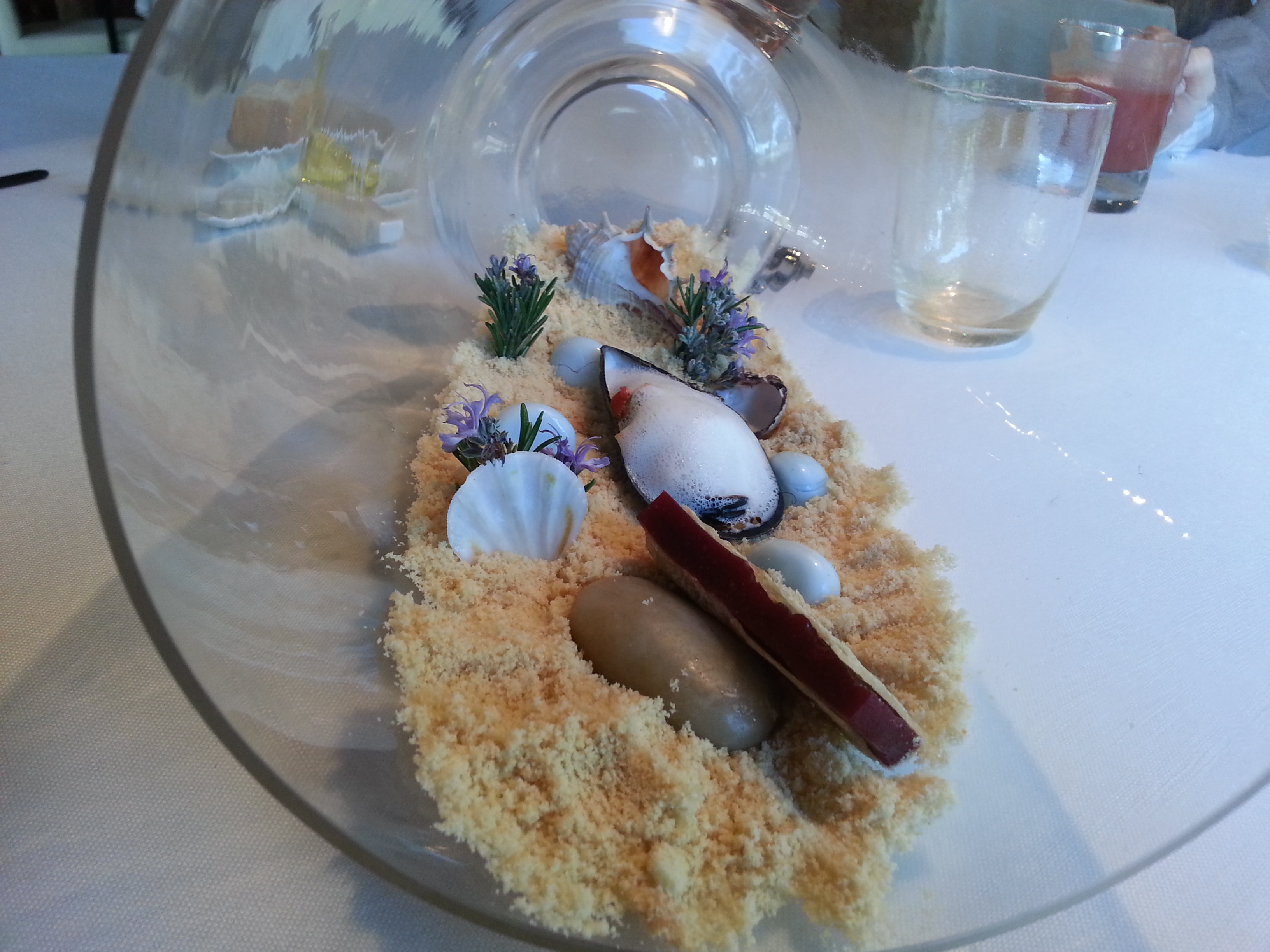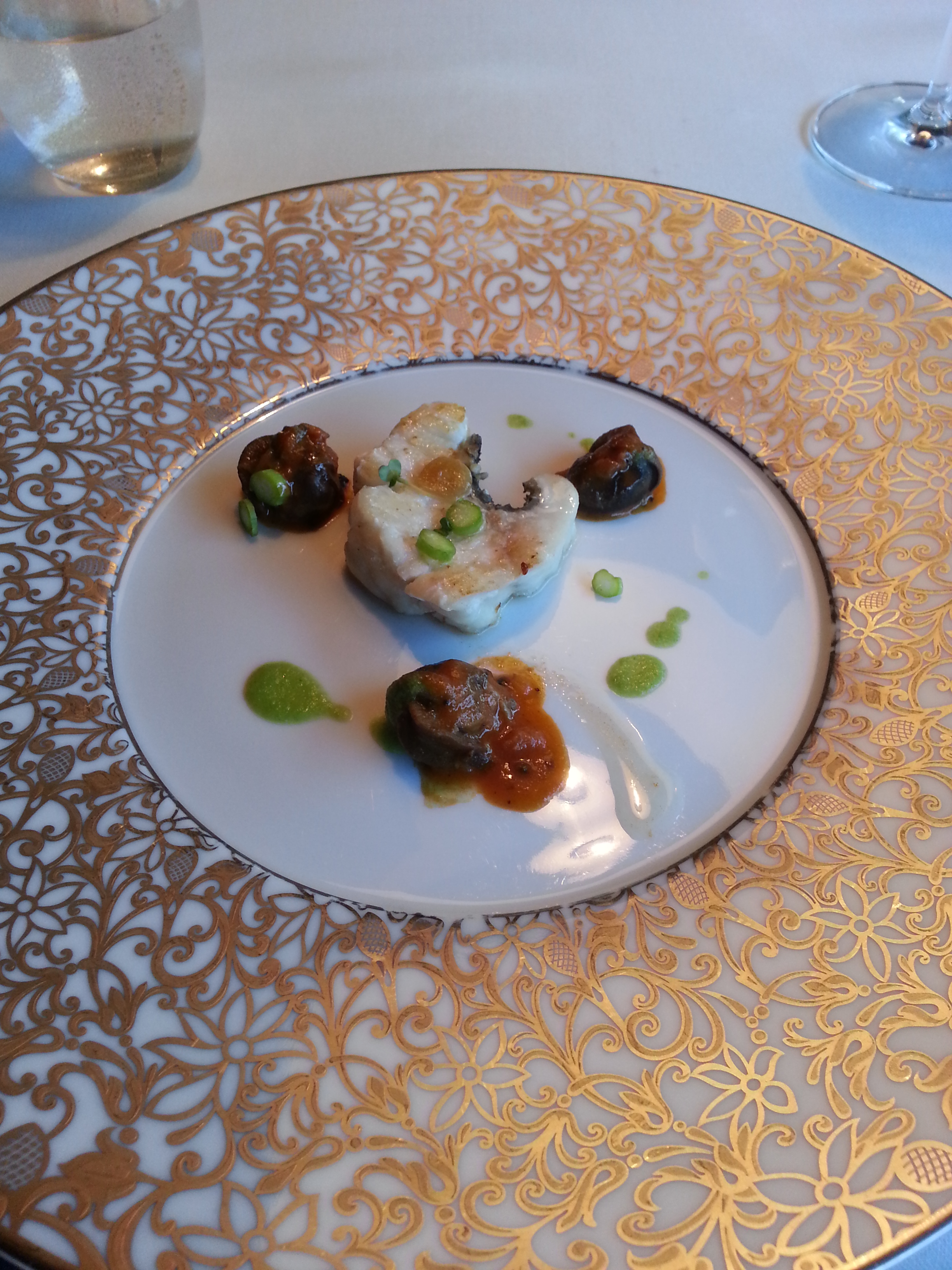 Y continuamos con el carrusel de platazos. El siguiente, Otoño en el plato. Una cama de puré de champiñones con cous cous, trompetillas amarillas y codorniz confitada. Ésta es una delicia y al confitarla consiguen que se la carne esté jugosa y se desprenda del hueso sin esfuerzo. Plato genial que lo culmina con un huevo de codorniz que podéis ver a la izquierda.