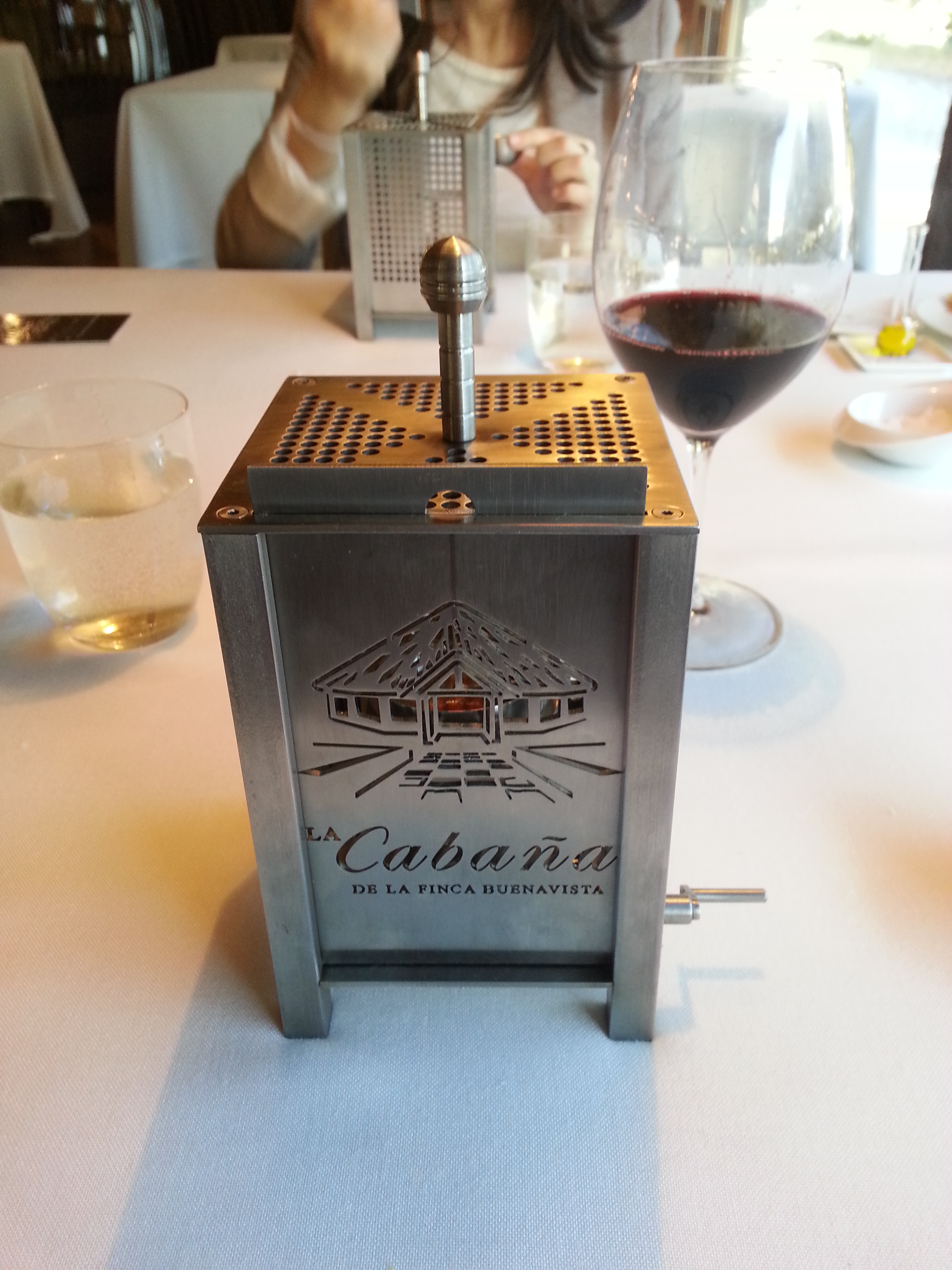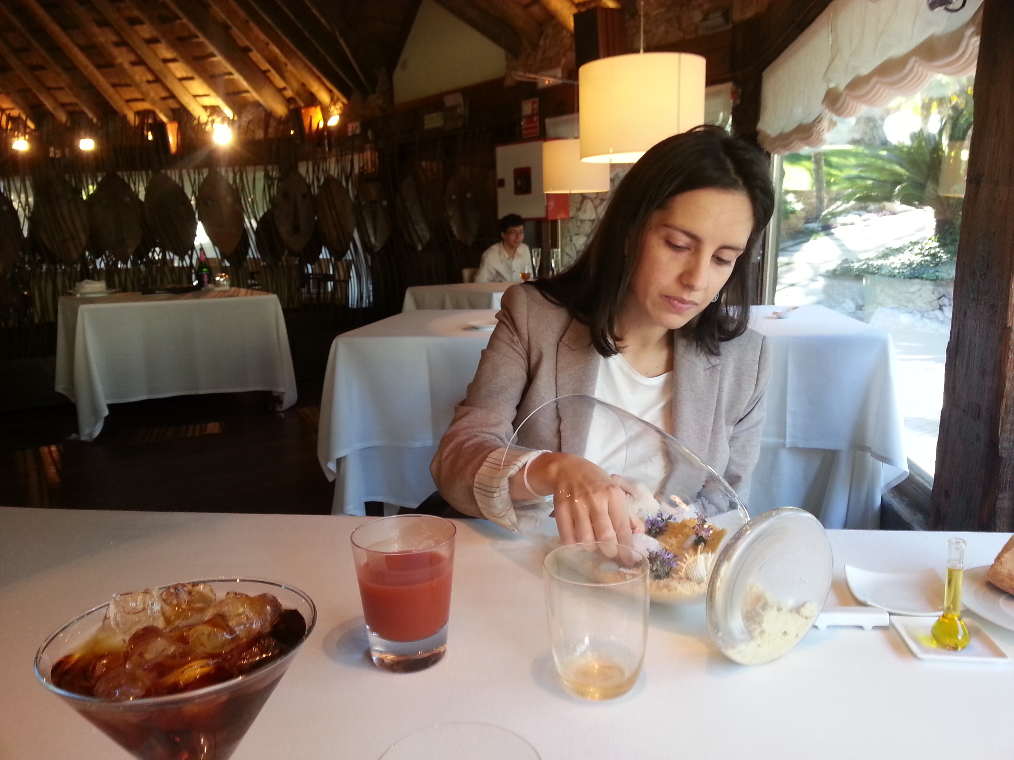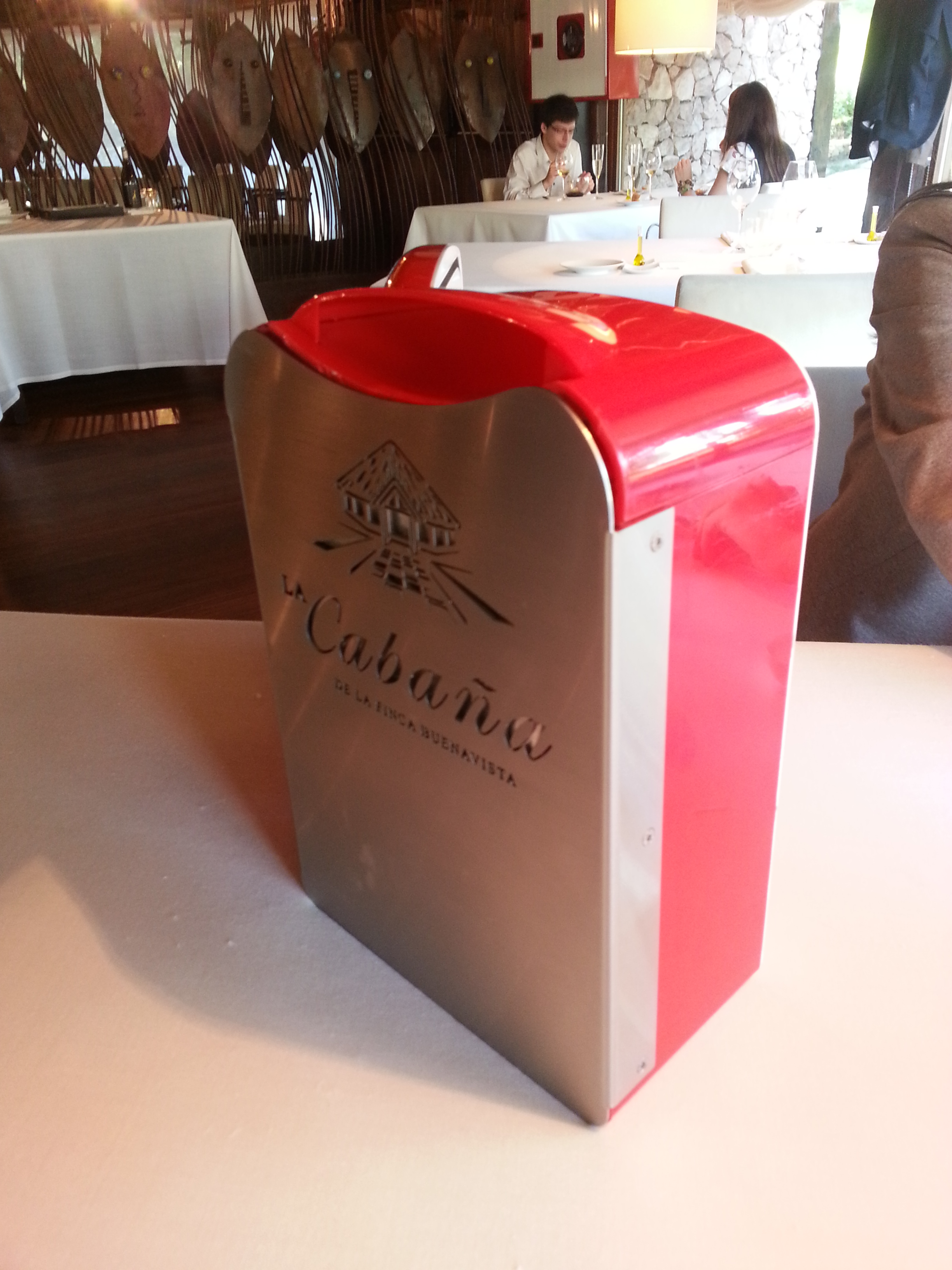 Y no veo el momento de presentaros el siguiente plato. La nevera en la mesa de La Cabaña. Muestra perfectamente la línea de innovación y ganas de sorprender de este restaurante. Como podéis ver en la siguiente foto, sirven una nevera por persona con varios entrantes. Al abrir la nevera, sale el humo que consiguen con carbónico y… te dan ganas de aplaudir. Y eso que todavía no has probado bocado.
