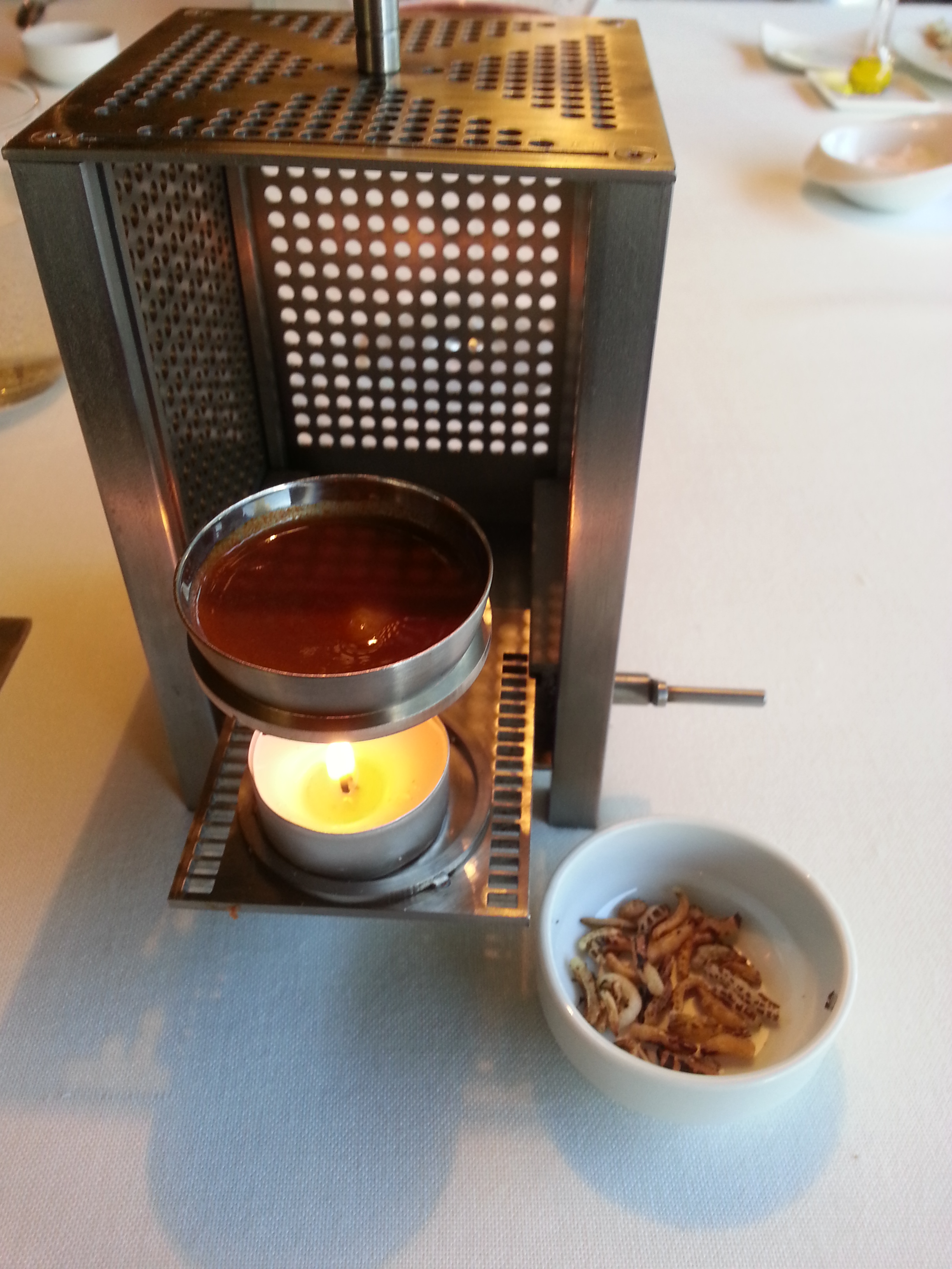 Pero esto no ha acabado aquí, ahora llega el último aperitivo con un lujo de presentación. Es el caldero con arroz salvaje. Toda una oda al plato murciano. En la foto podéis alucinar con la presentación. En un cubo metálico con su logo y de donde el caldero coge temperatura a partir de la llama de una vela. Este me pareció muy original pero en cuanto a sabor, el aperitivo en sí no me pareció del nivel de los anteriores. Esta bueno pero es que la nevera nos dejó alucinados.