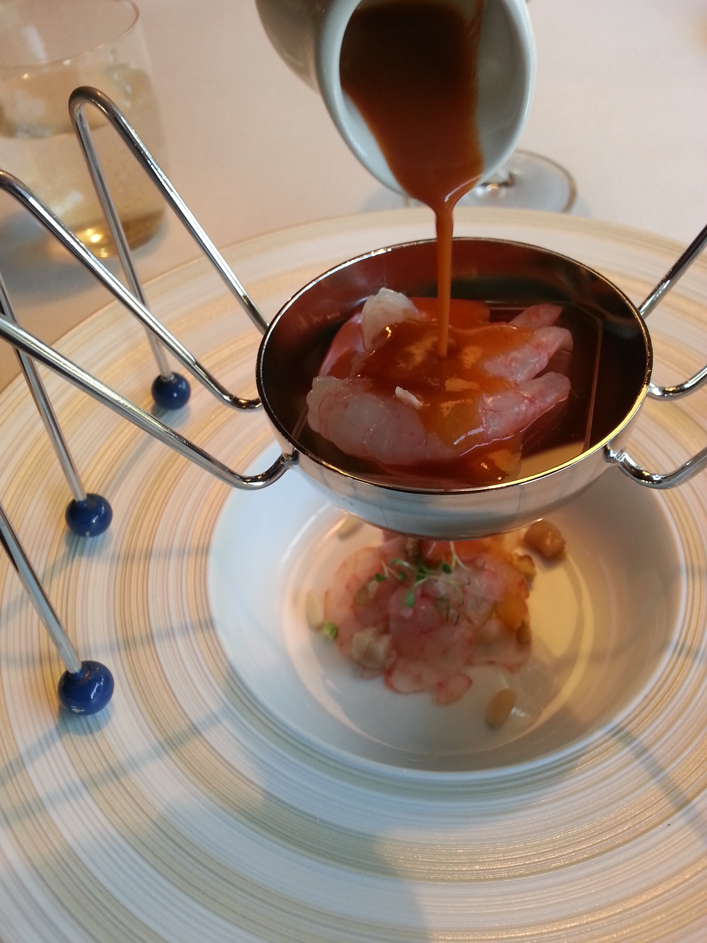 Aunque no os lo creáis, lo que hemos contado hasta ahora sólo son los aperitivos. Ahora comenzamos con los entrantes. El primero, carpaccio de quisquilla con un alioli de mango. Brutal. La quisquilla era de un sabor bueno y potente y además de buen calibre y el alioli de mango le iba como anillo al dedo. Además, lo acompañaban de un guiso que le daba un golpe más de intensidad. El plato se divide en las quisquillas enteras en la «plataforma arácnida» de arriba y por otro lado la parte del plato donde están laminadas y mezcladas con el alioli.