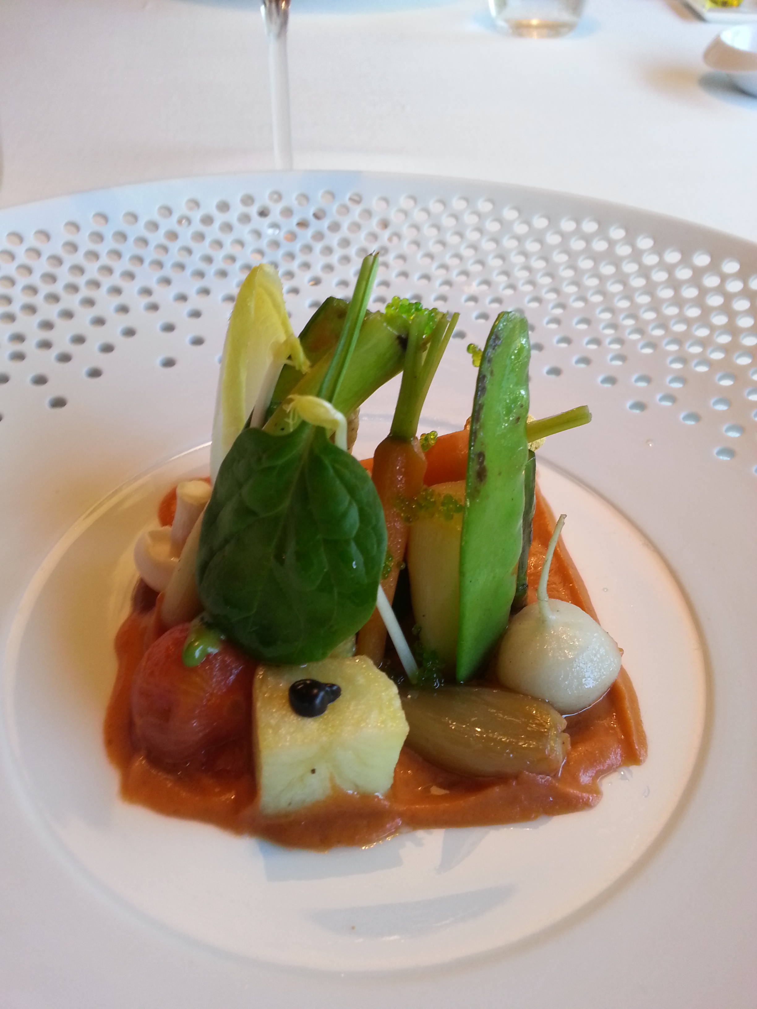 Siguiendo con el menú, el siguiente entrante fue uno de los platos que más me gustaron. Las verduras a la parrilla sobre crema de… creo que ñoras. En la foto podéis ver la gran variedad de verduras que forman el plato. Calabaza, endivia, zanahoria, judias verdes… incluso un par de palomitas. Todo realmente bueno y un plato natural a más no poder y sobre todo que promociona el producto de la comarca. La presentación, como el resto de los platos, cuidada y genial. La crema muy buena, con bastante ñora que hace buen contraste con las verduras.