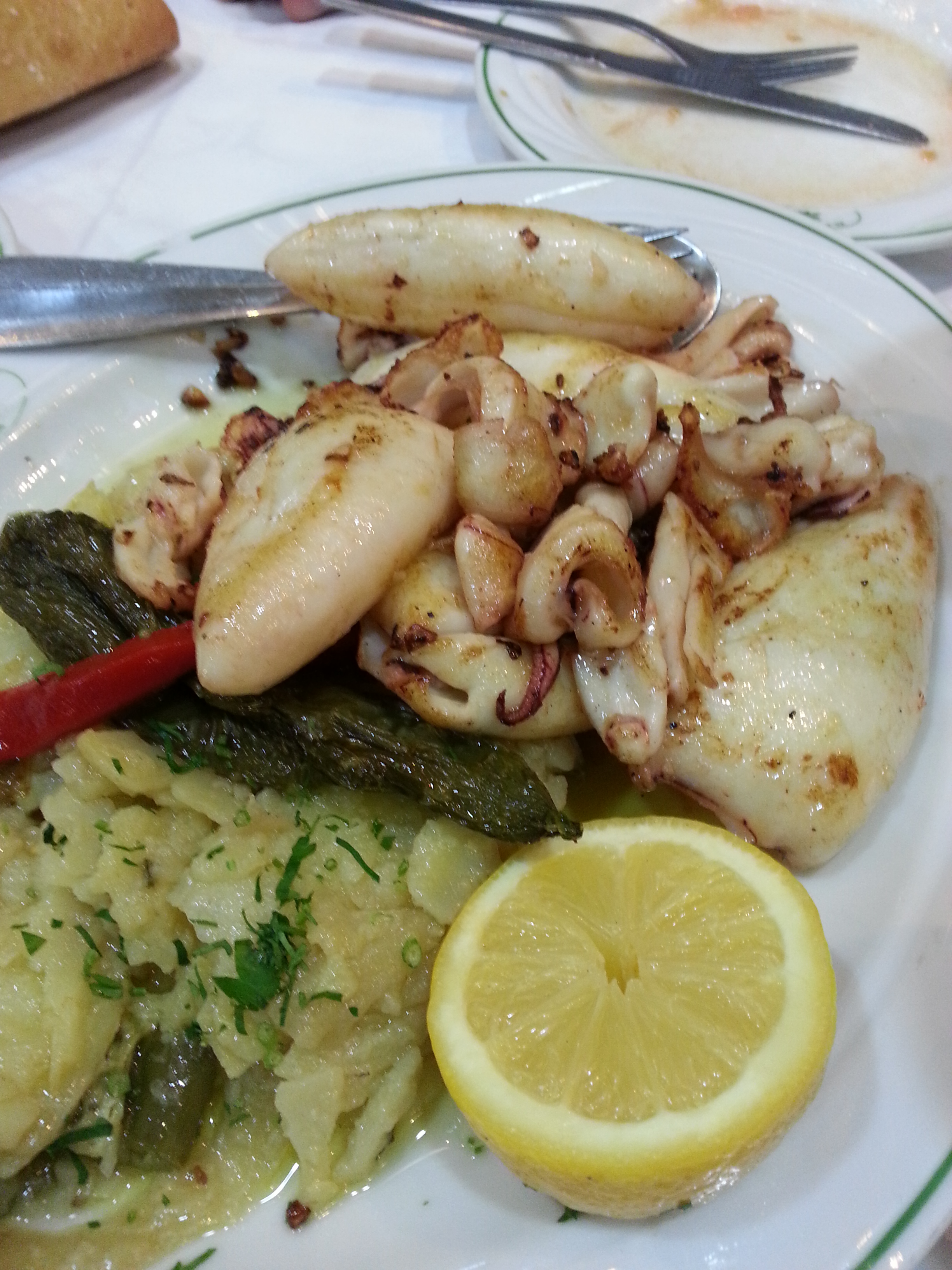 El siguiente plato si que nos gustó mucho más. Los chipirones a la plancha. Los sirven con unas patatas panadera. Y están realmente buenos.