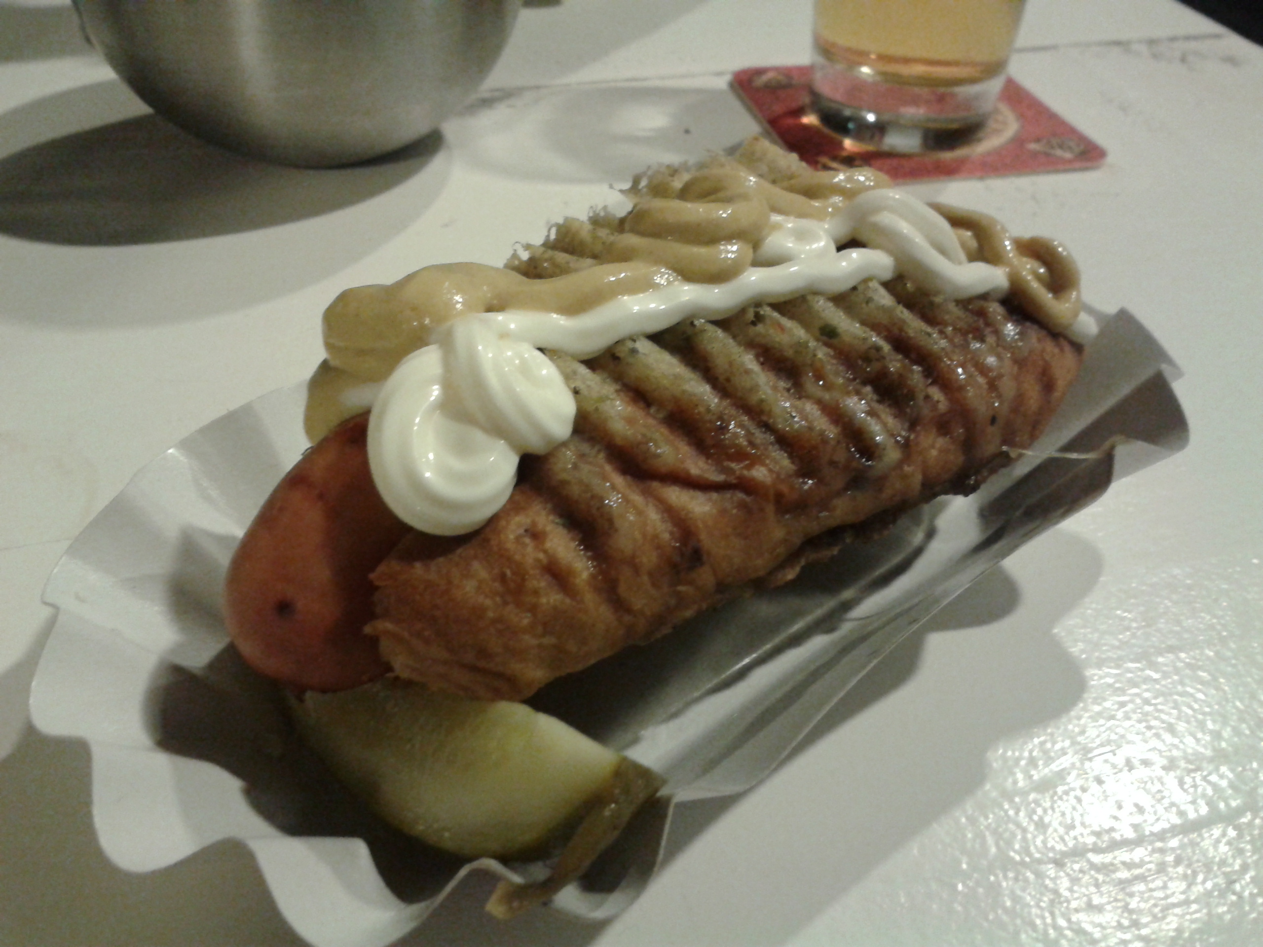 Es una cerveza que entra sola y es la compañera perfecta para una tarde de tapeo o para refrescar la boca. Con cada consumición, en el tap room, te ponen una tapita de encurtidos, aceitunas o patatas fritas, que entran solas. Con ello pedimos para hacer estómago un perrito que ellos llaman El Perrito Perfecto (~5€), aunque en algunos artículos he visto que se referían a él como Perrito Estanis o Perrito Sudestada porque supuestamente es una creación del chef de Sudestada. Como podéis ver tiene una pinta tremenda: el pan es de centeno, muy sabroso, la salchicha gordita y de primera calidad, y lo calientan en una especia de sandwichera enorme justo después de ponerle un lonchón de queso encima que se derrite y se queda entre crujiente y derretido; para rematar algunas especies espolvoreadas y un trozo de pepinillo en vinagre muy rico. Mostaza, mayonesa y ketchup a tu gusto.