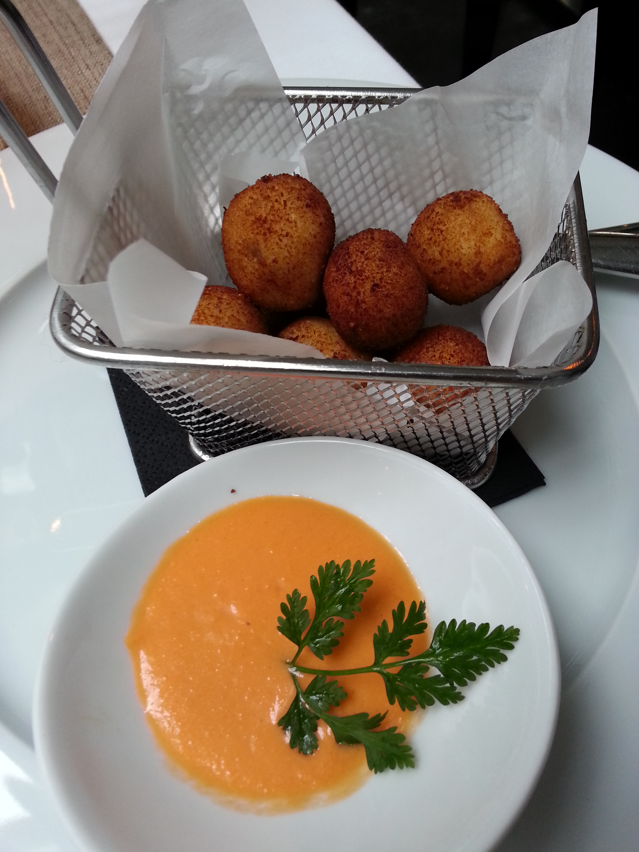 Al ver los entrantes nos fuimos sin pensarlo dos vecesa los clásicos. La ensaladilla rusa con melva canutera y regañás y por otro lado las croquetas de jamón de bellota con salmorejo. La ensaladilla me pareció de categoría. Muy buena y con una mayonesa estupenda y en su justa medida. Y con melva de primera. Muy recomendable. Las croquetas son suaves y están buenas pero en nuestra opinión si tenemos que elegir… nos quedamos con la ensaladilla. Pero vamos que si os gustan las croquetas probadlas que no os van a defraudar.