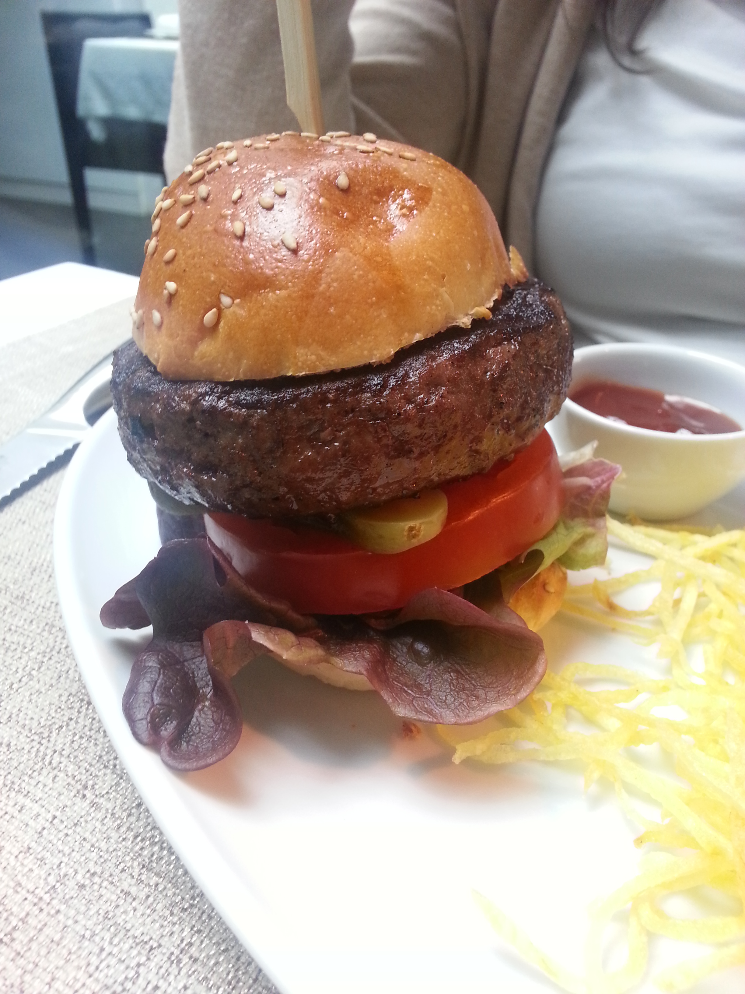 Y pasando a los platos principales, pues empezamos por la joya de la casa, su hamburguesa americana. Como podéis ver, tiene una presentación estupenda. Y no sólo es la pinta, sino que os aseguro que el sabor es excelente. Carne de primera acompañada de los ingredientes clásicos que no le quitan protagonismo. Os dejo un par de cortes.
