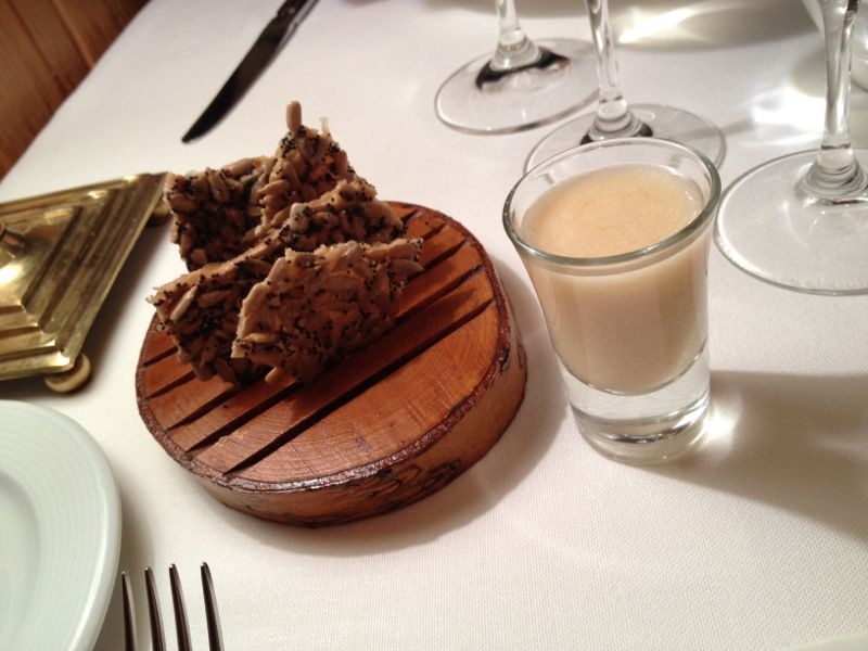 El comedor como podéis ver es muy agradable, con mucha madera y mantel de tela en las mesas. Nosotros nos sentamos junto a la ventana y el espectáculo de ver neva a saco mientras cenas es genial e hipnótico (lo único malo es que entraba un poco de fresqui). Tienen una carta bastante amplia, pero mucha gente, como nosotros, suele optar por el menú de noche (36€), en el que pruebas bastantes cosas a un precio muy ajustado, y con un plato principal muy digno.