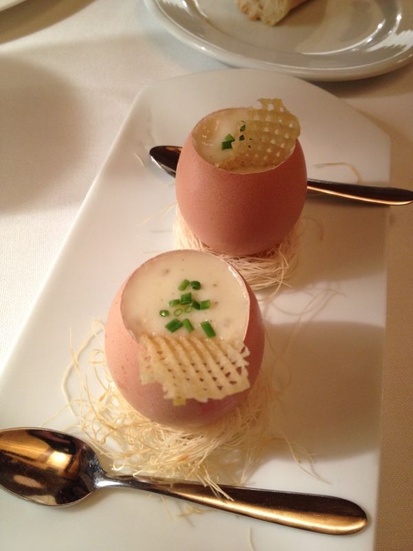 Tras los sándwiches, un par de huevos pasados por agua con crema de patata y mantequilla de tartufo. Viene ya todo mezclado y listo para comer con la cucharita. Importante hacerlo rápido antes de que se enfríe. El sabor magnífico con su toque de trufa.