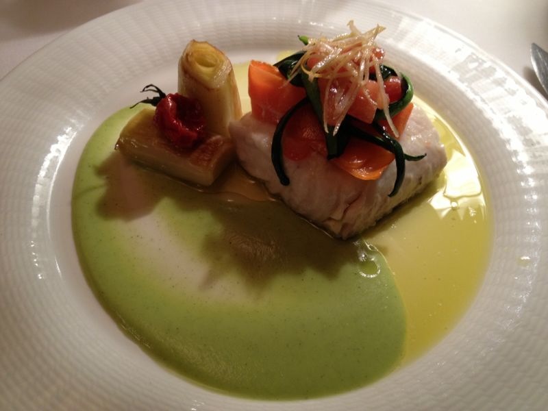 Ambos platos estaban buenos, pero como podéis ver en las fotos, van a compañados de un festival de complementos y salsas, lo que hace que más que un plato parezca un circo de cinco pistas. Los pescados eran de primera, y el esturión pescado en el propio valle, pero todo lo que los acompaña no estaba bien acompasado y resultaba excesivo. Es imposible tomar a la vez todas las salsas y verduras con el pescado, así que acabas haciendo como mini platos y todos saben diferentes según los vas combinando, y se echa en falta una armonía de sabor en el plato. Aparte de eso a mí no me gustó mucho el esturión, pero reconozco que era más por el sabor del propio pescado, que por que estuviera mal preparado. La verdad es que los pescados de río al horno y yo no encajamos del todo. Ahumados sin embargo me encantan.