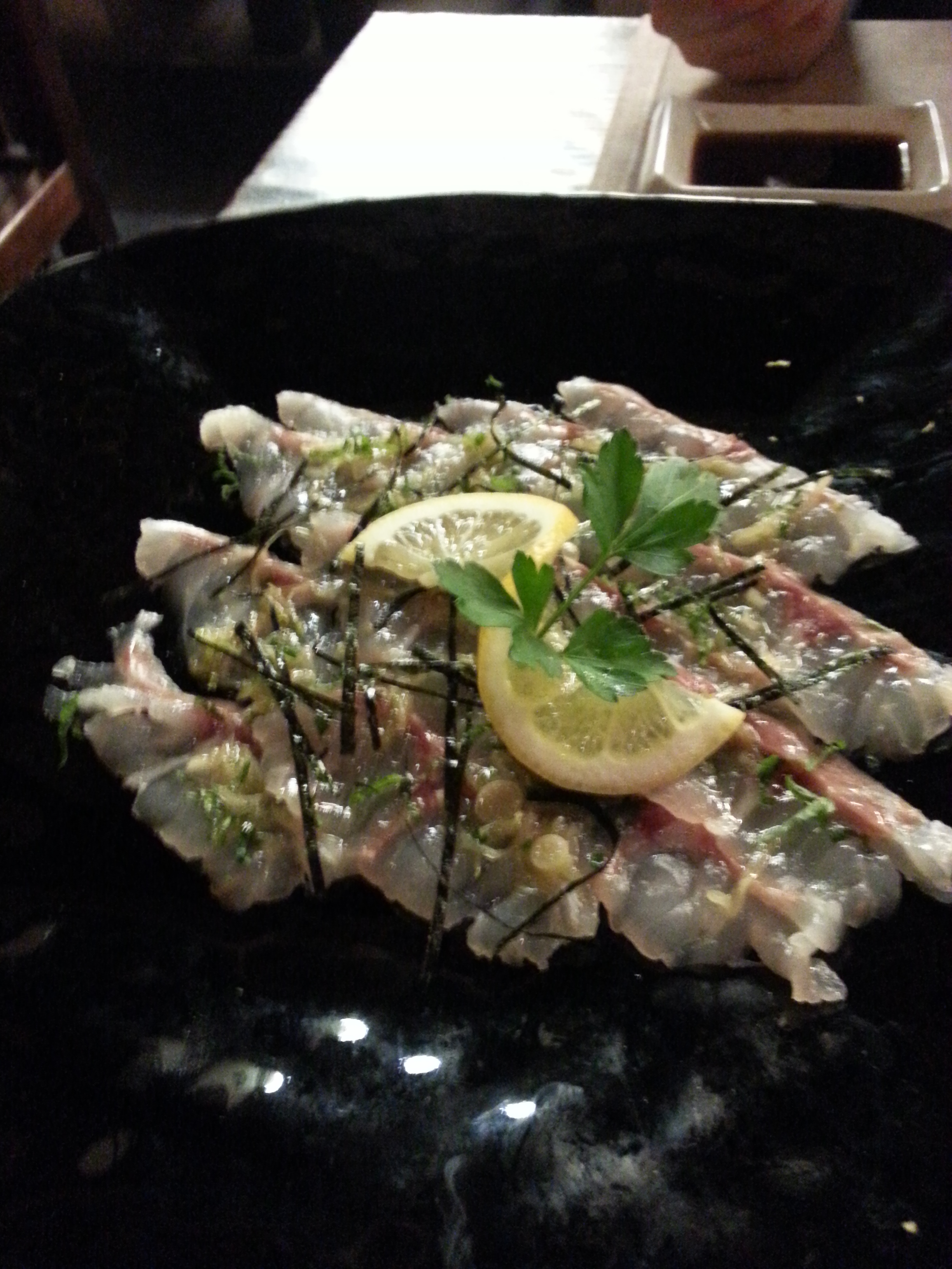 El siguiente plato fue el carpaccio de lubina. Suave, fresco y ligero. Estaba muy bueno pero creo una vez pedido el sashimi… este plato nos lo podíamos haber ahorrado y haber pedido algún plato caliente en su lugar.