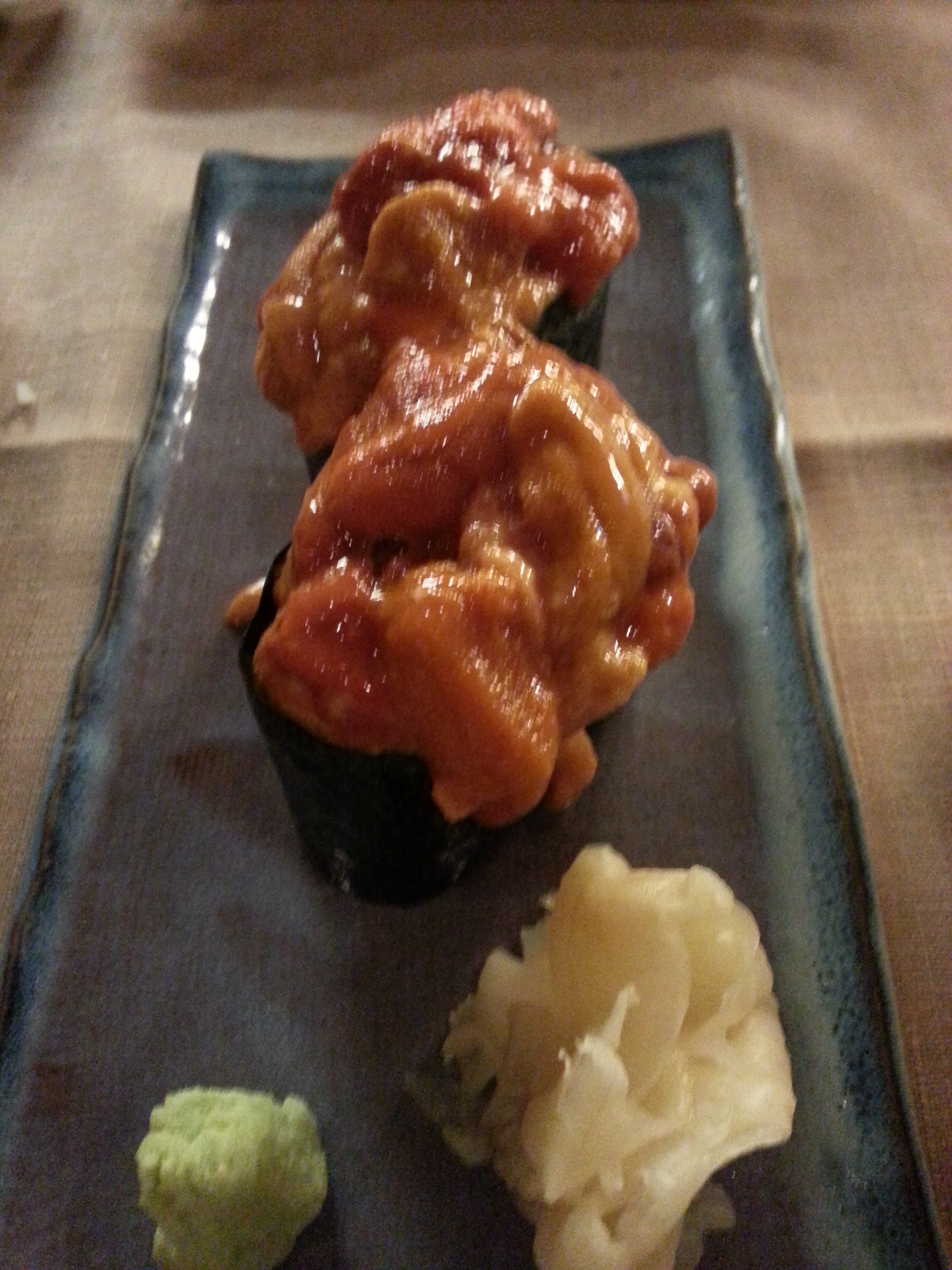 Y lo siguiente sí que fue una auténtica maravilla. Los niguiris de huevas de erizo. Un bocado exquisito donde los haya. Con mucha hueva que es puro sabor de mar. Os recomiendo ir a Himawari aunque sólo sea a probar estos niguiris. Eso sí, baratos nos son.