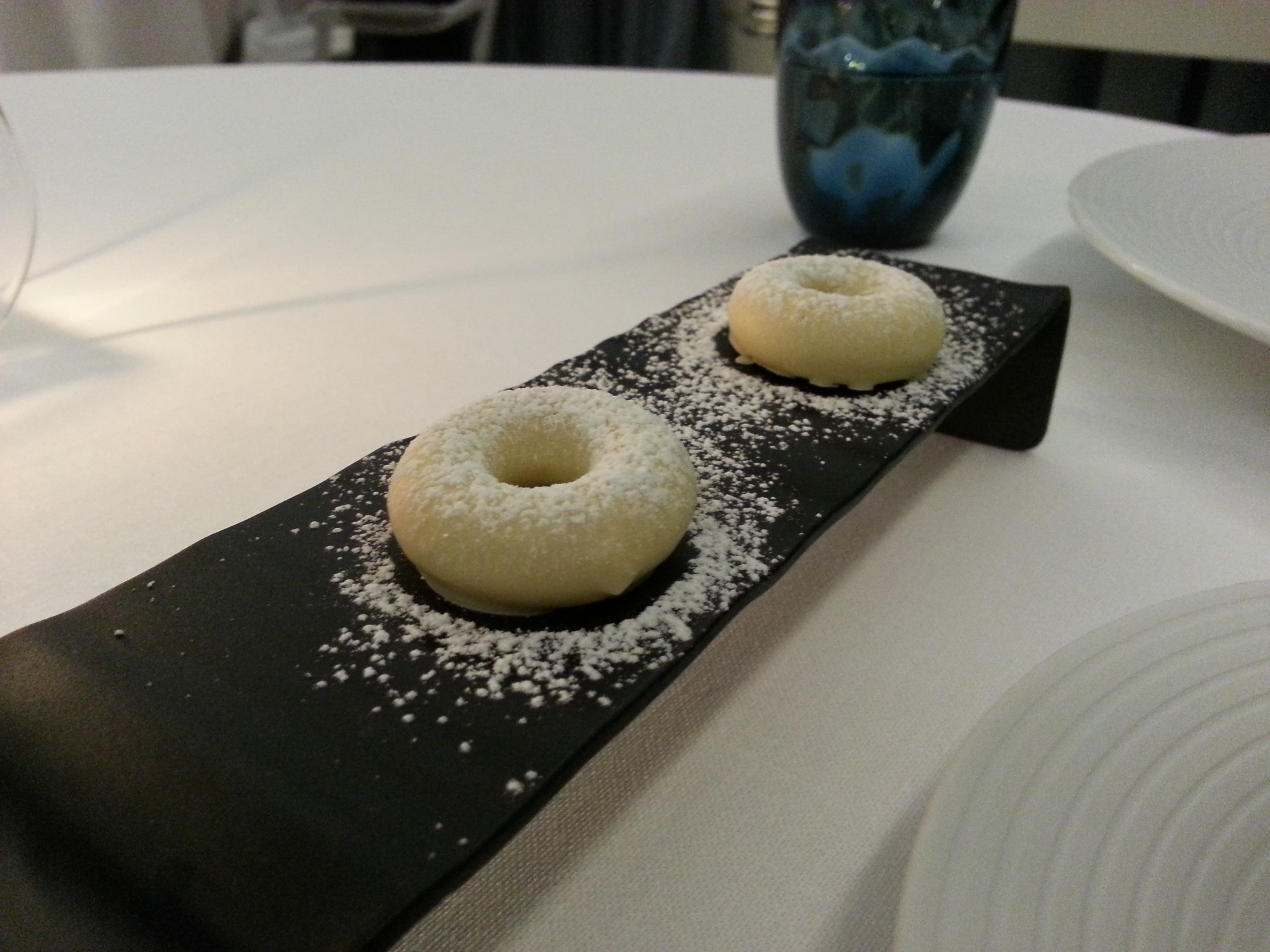 Después pasamos a las fresas heladas rellenas con parmesano y a los filipinos de foie. Empezamos con una par de fotos de los filipinos, que nos parecieron realmente buenos y disfrutamos junto con una copa de cava. Aquí es donde empiezas a jugar. El primer gusto es el de los filipinos de toda la vida, que te lleva directamente al recreo en el colegio, pero de ahí pasas al foie que está realmente potenciado por el sabor dulce anterior. Y las fresas también muy buenas. Frescor dulce acompañado de un queso potente. Este conjunto de snacks los sirven a la vez y es todo un acierto porque se complementan de maravilla.