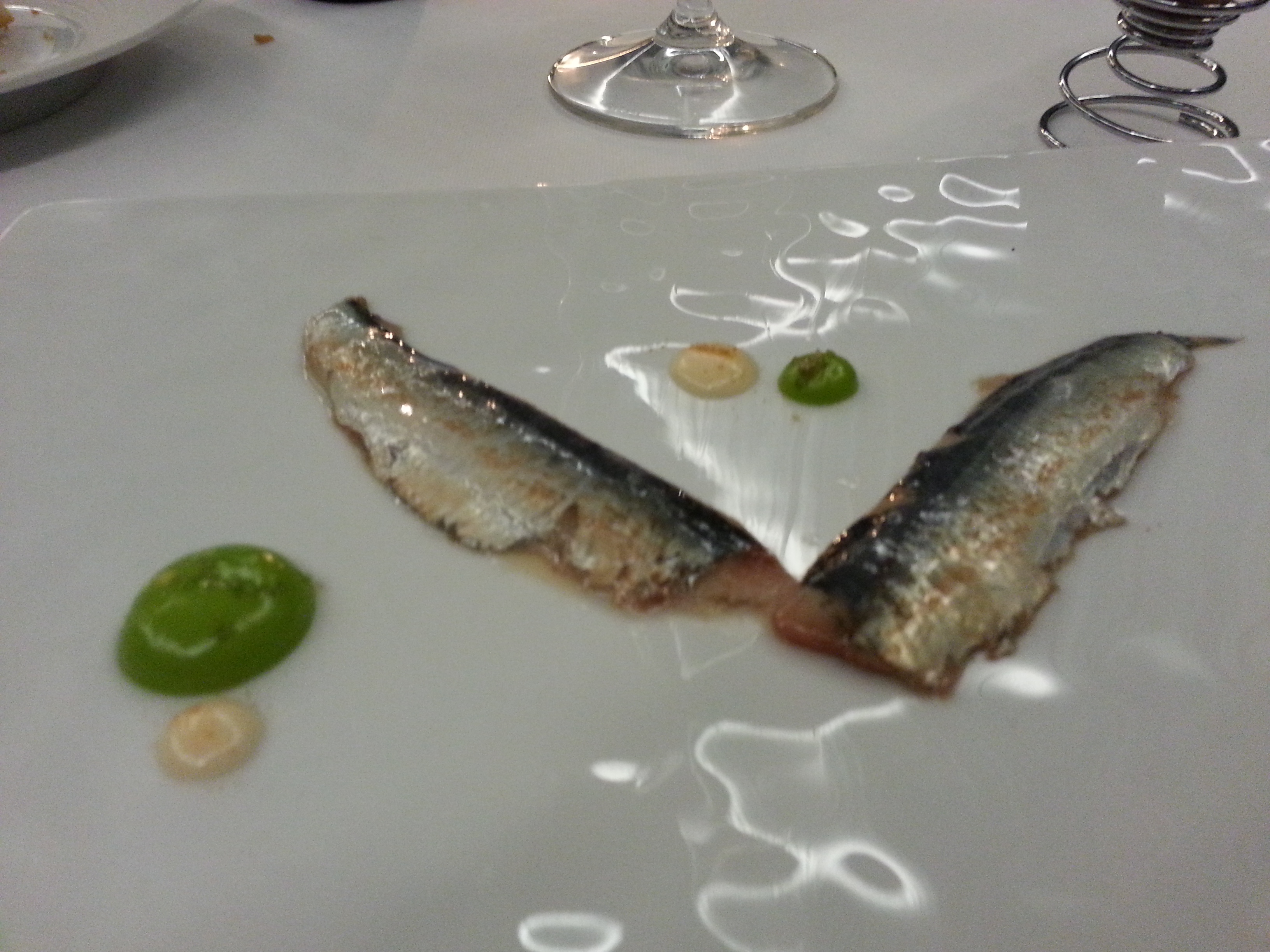 Pues empezamos con unos lomos de sardina acompañados de pescaito frito y mayonesa de mojito. Muy bueno, pero los lomos de sardinas me parecieron un poco pequeños. Un poco más de calibre para potenciar el sabor del pescado azul habría estado bien. Eso sí, la mayonesa de mojito, realmente buena y original.