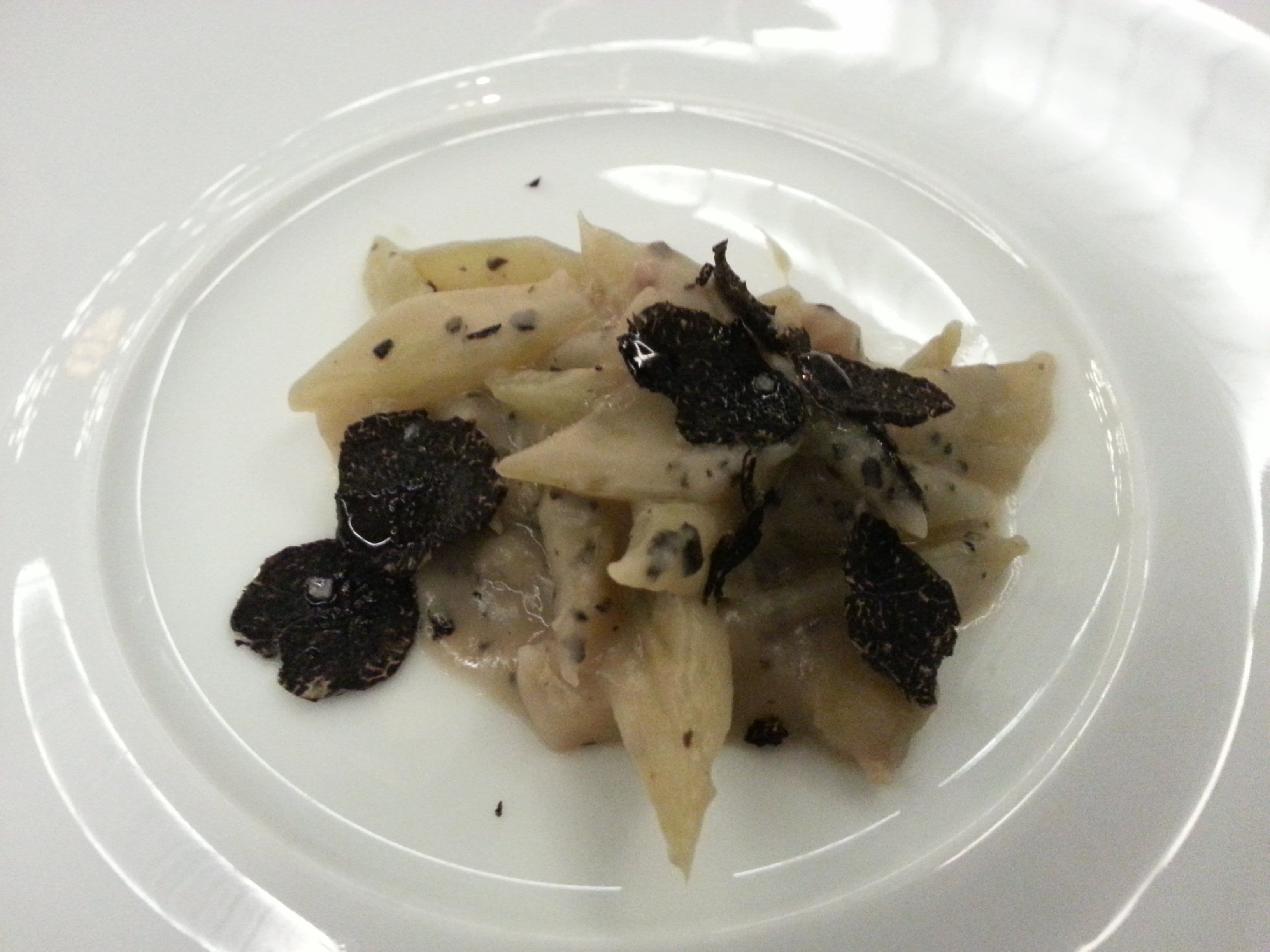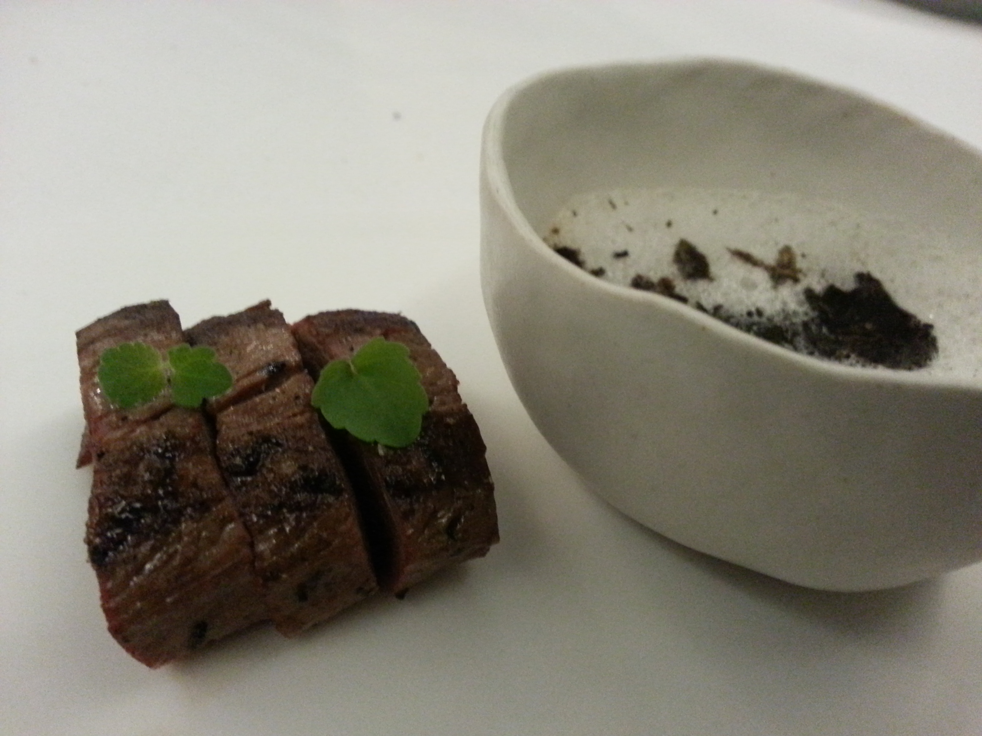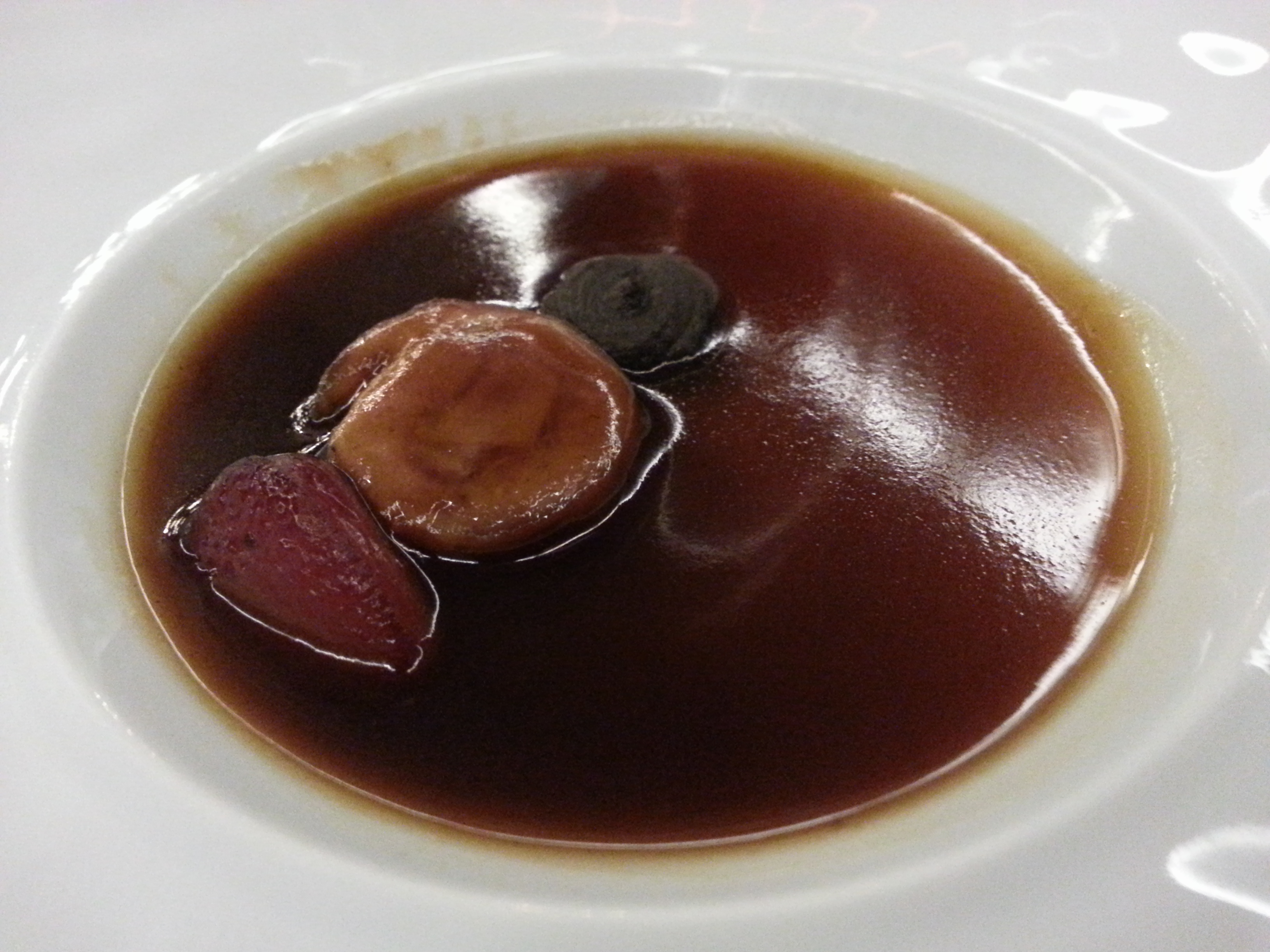 El siguiente plato era una novedad respecto al menú degustación de cata. Fue una royal de pichón que sustituía al ramen de ternera y anguila ahumada. La royal estaba estupenda. Con la densidad perfecta y potente de sabor. El pichón también jugoso y sabroso. El pichón venía acompañado de una trufa negra, que daba aún más sabor al plato. Un plato potente que cambia el tercio para empezar con tapiplatos más contundentes.