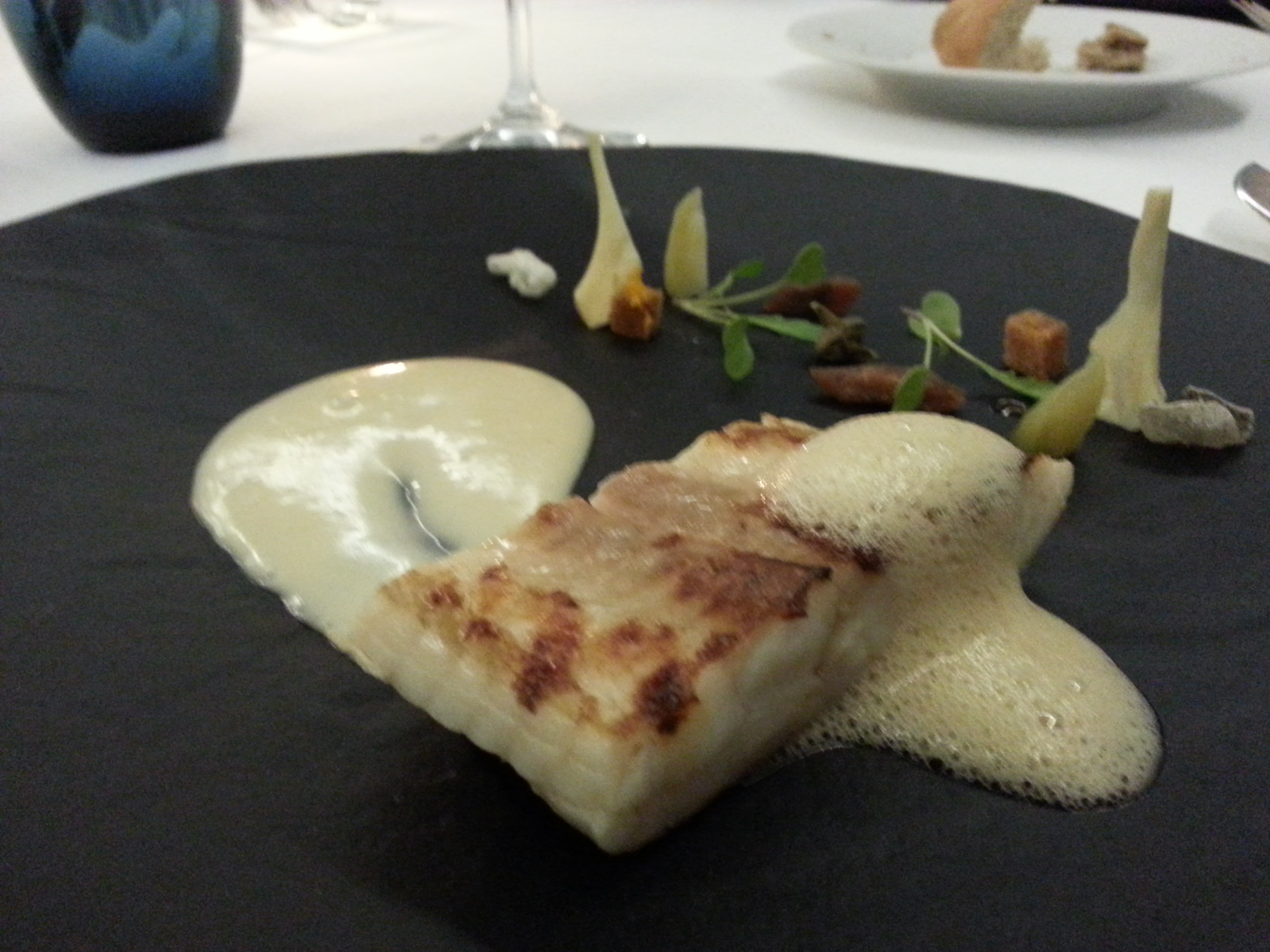 Y pasamos a otra maravilla, las borrajas con castañas asadas y trufa. Un plato muy invernal para las fechas en las que fuimos (finales de abril) pero realmente bueno. Los tres sabores muy definidos y muy bien ligados. Otro de los platos que nos encantaron.