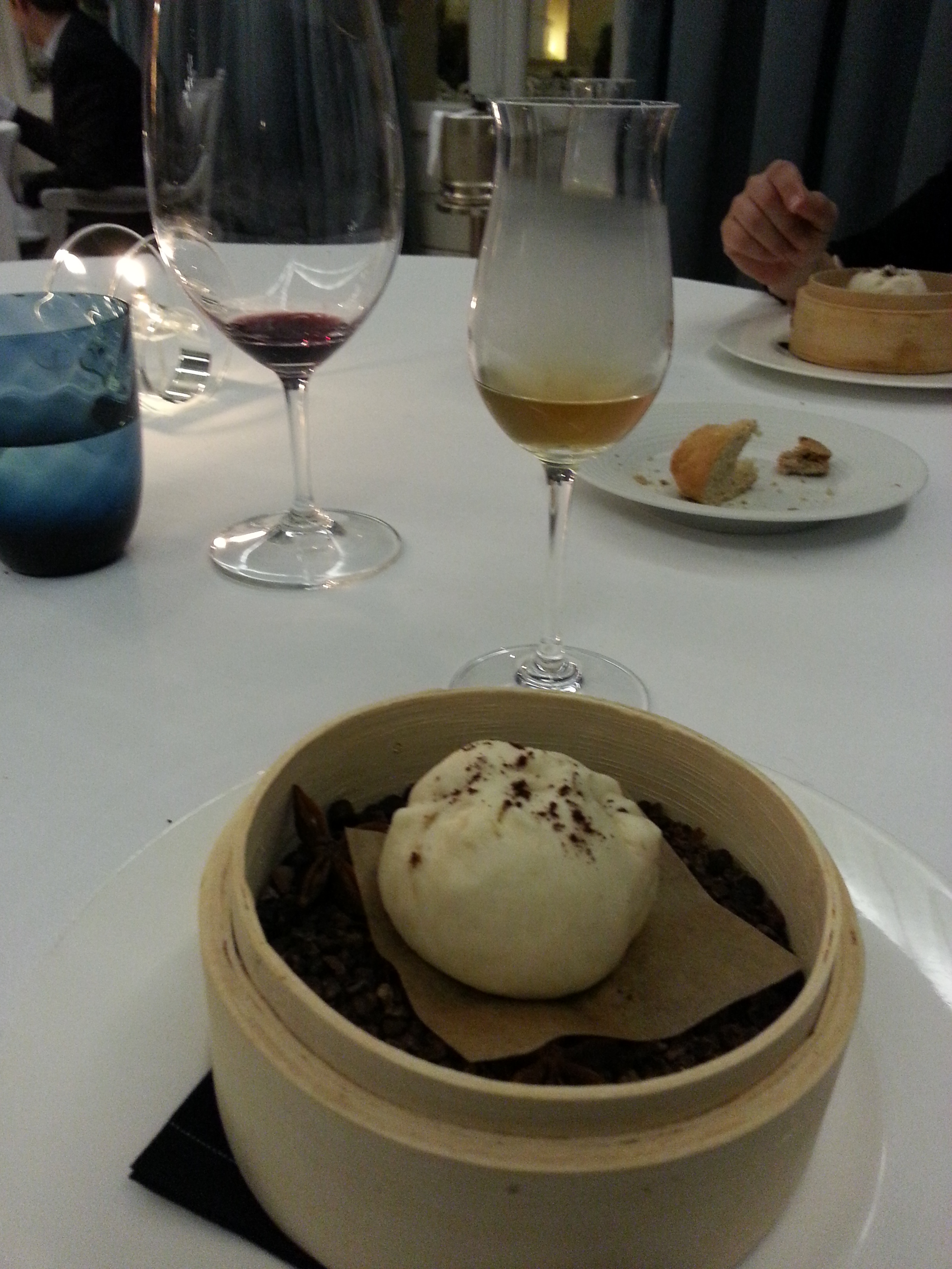 Y a todo esto todavía no os he comentado nada de los vinos. Nos dejamos aconsejar por el sumiller que nos fue maridando durante todo el menú. Como os podéis imaginar la atención fue exquisita y en ningún momento faltó vino en la copa. Cosa peligrosa. El menú lo comenzamos con un cava de Raventós L’Hereu 2010 y lo continuamos con una sucesión de vinos argentinos y de la Rioja. A mitad de los snacks, nos pasamos a un Bobó 2009 que nos gustó muchísimo. Una gran sorpresa llegada de Mendoza (Argentina). Ya me estoy buscando unas cuantas botellas. Al comenzar los tapiplatos pasamos a un Gómez de Segura 2004. También estupendo maridaba perfectamente. Y para terminar con los tapiplatos volvimos a Argentina para tomar un Trapezio 2009 (de la mismo bodega que el Bobó). Y con los postres, un Pedro Ximenez Noe que era toda una delicia.