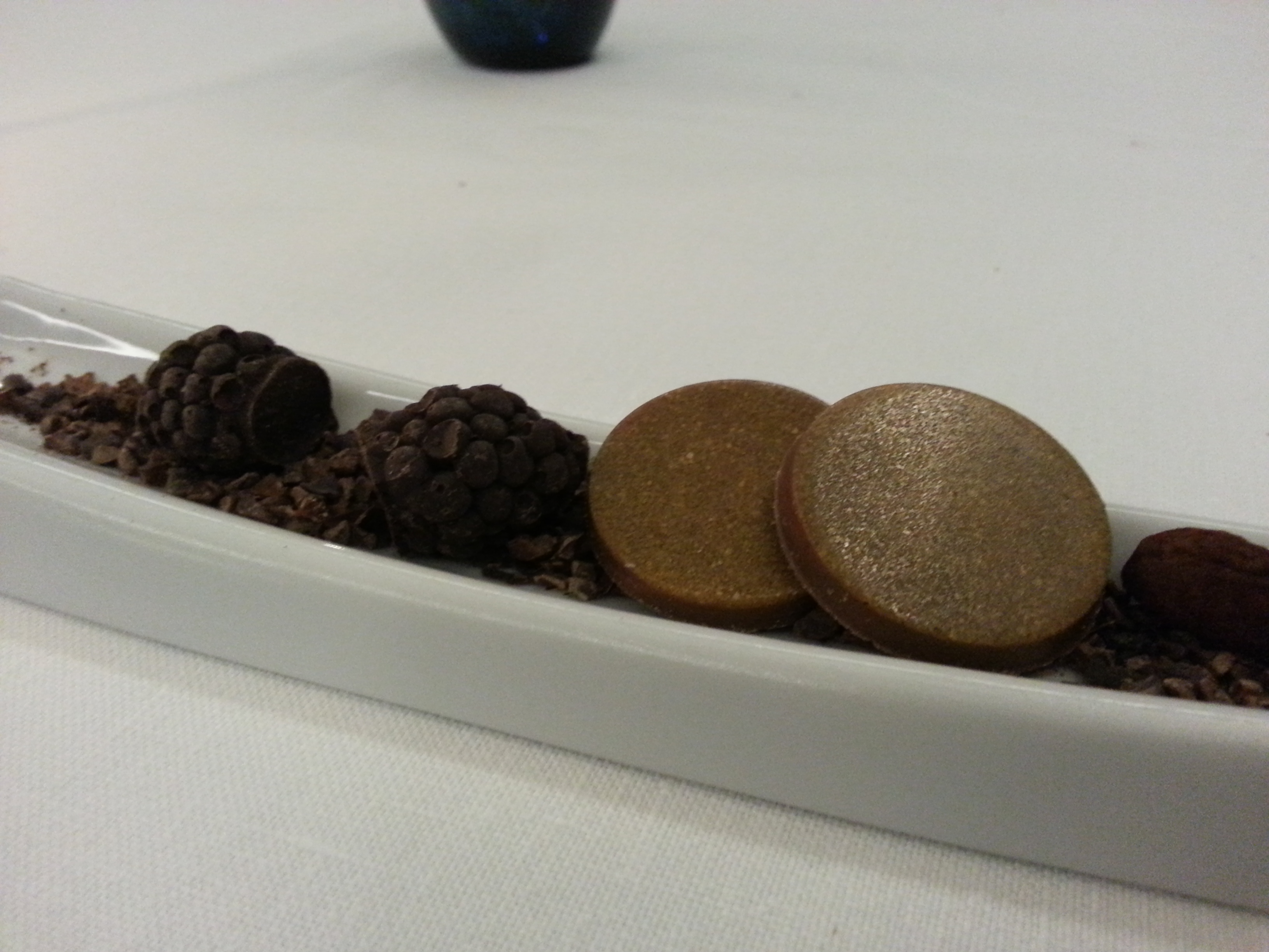 Acabamos el menú con lo que llaman las Pequeñas Locuras. Sus bombones de moras con chocolate negro, fruta de la pasión y trufas. Una maravilla.