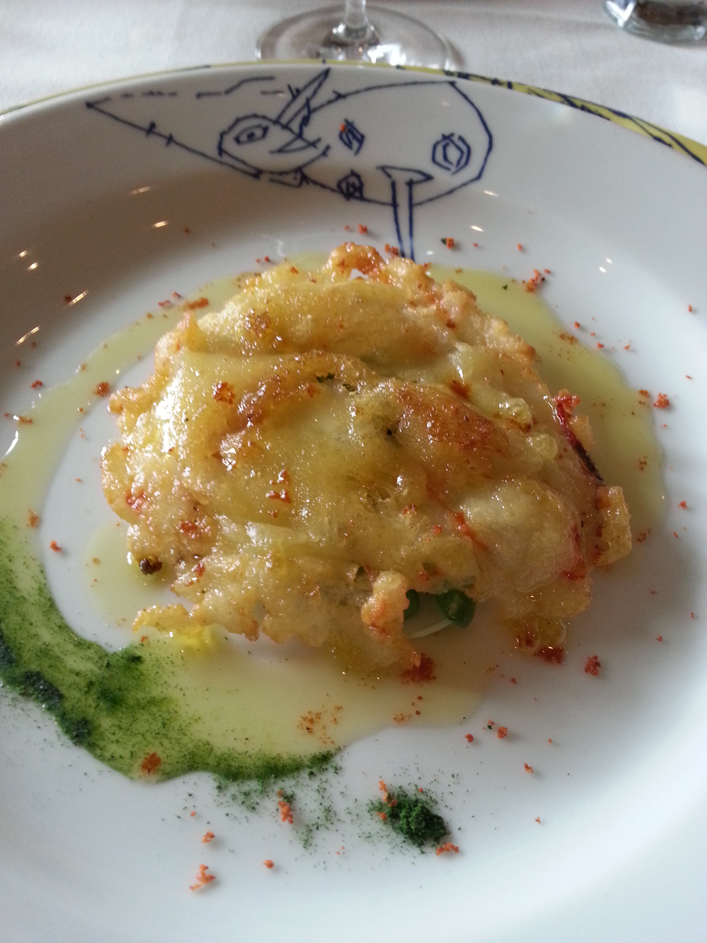De ahí, a la gamba roja espalmada sobre corugas. Bueno espalmada, esparracada o esparruchada, como queráis decirlo. La cuestión es que la gamba roja está aplastada y la hacen estilo tortillita de camarones. Está realmente buena y con las corugas es un aperitivo excepcional.
